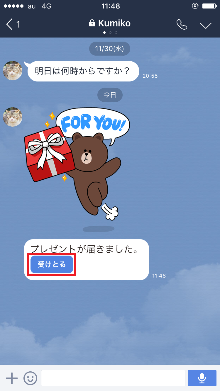 スタンプをプレゼントされると、相手のトーク画面に下のようなメッセージが表示されます。