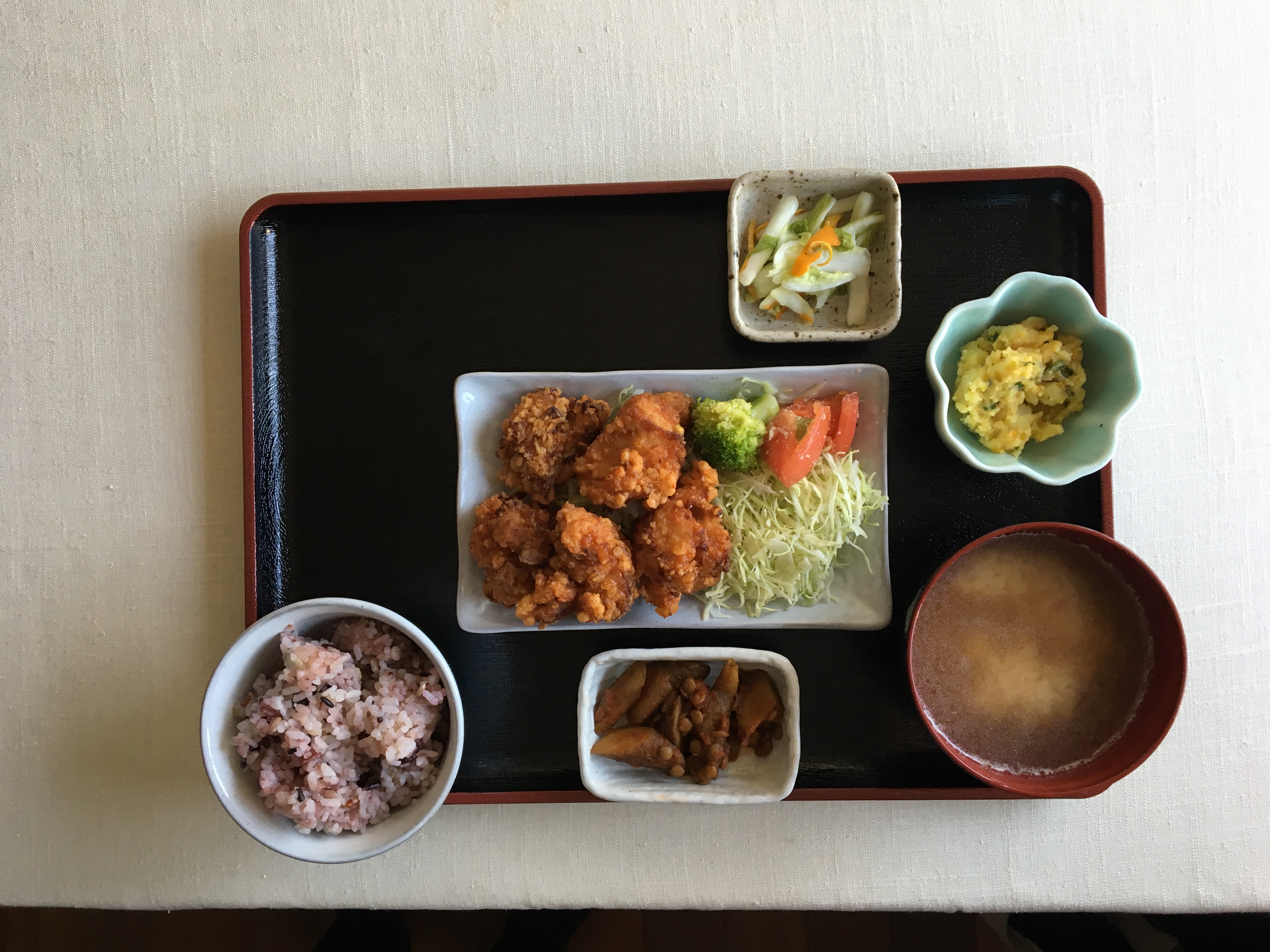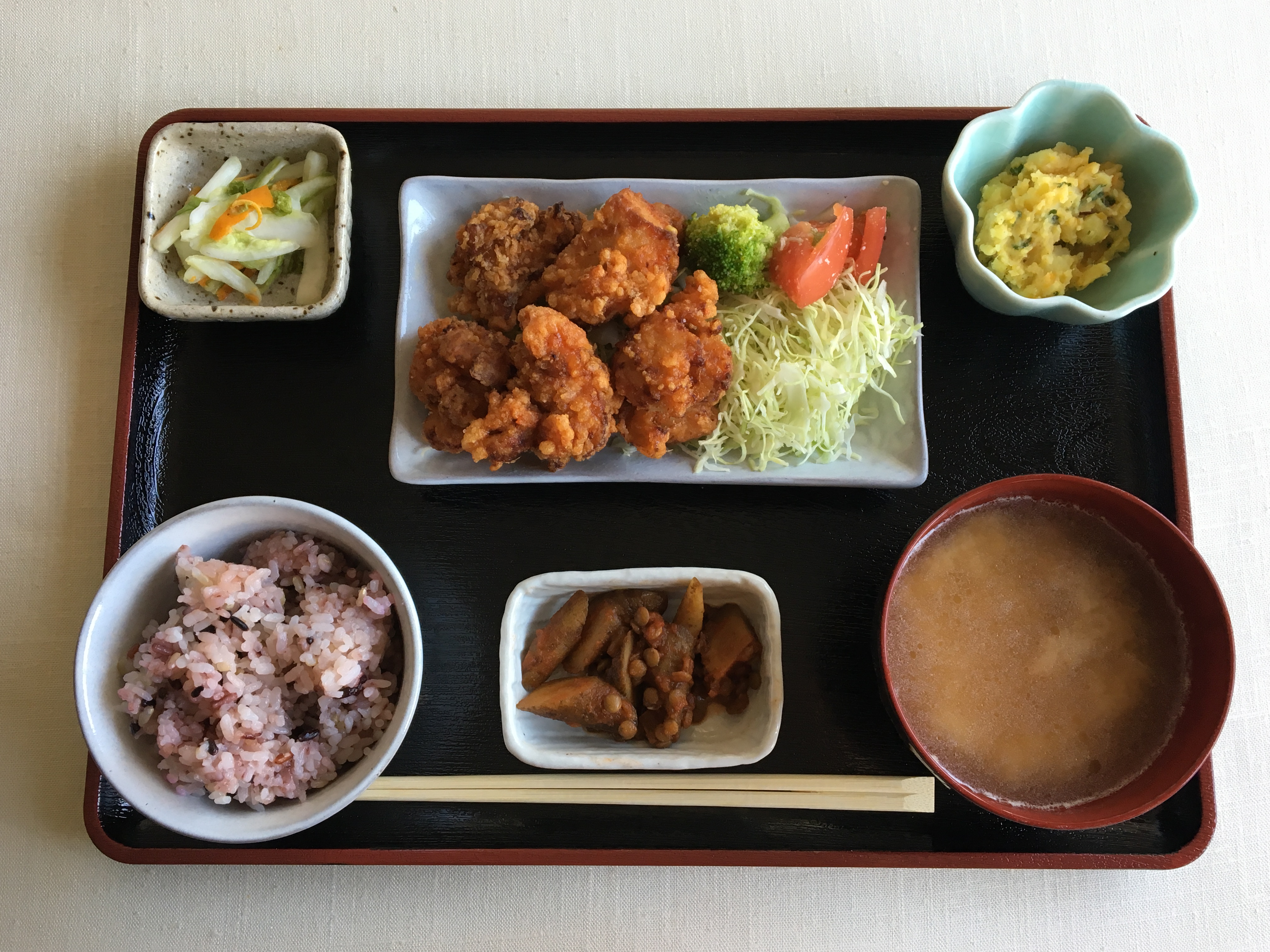 「まずは主役である “から揚げ” のお皿を真ん中に置きます。次に小鉢を味噌汁のほうに寄せていきましょう。お盆の左上を中心にして “おうぎ型” になるようなイメージです。そうするとお盆の左側に何も置いていない部分ができますね。この “余白” がポイントなんです」(園田さん)