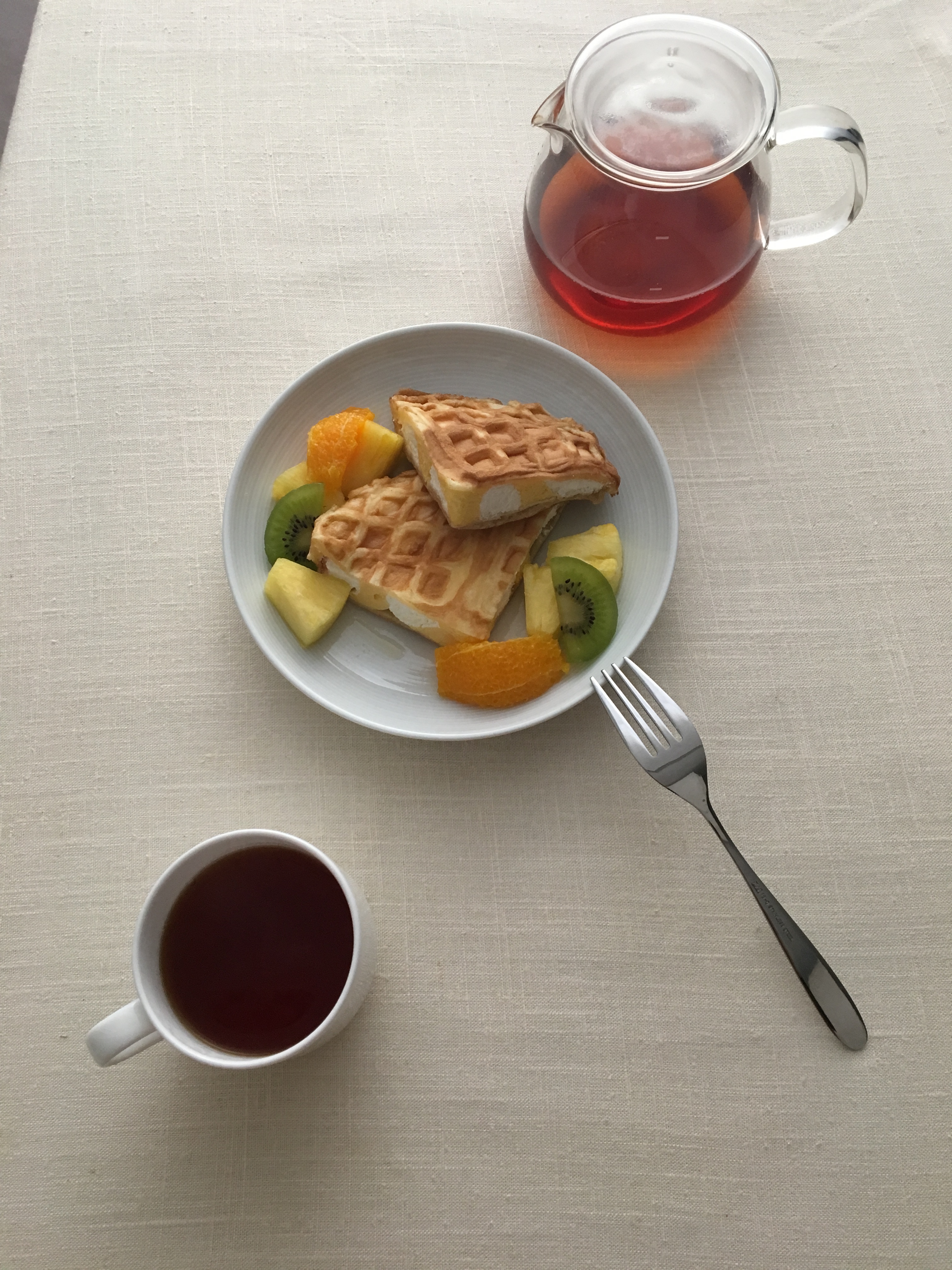 今回はワッフルのお皿の前にティーカップ、後ろにティーポットを置きました。
