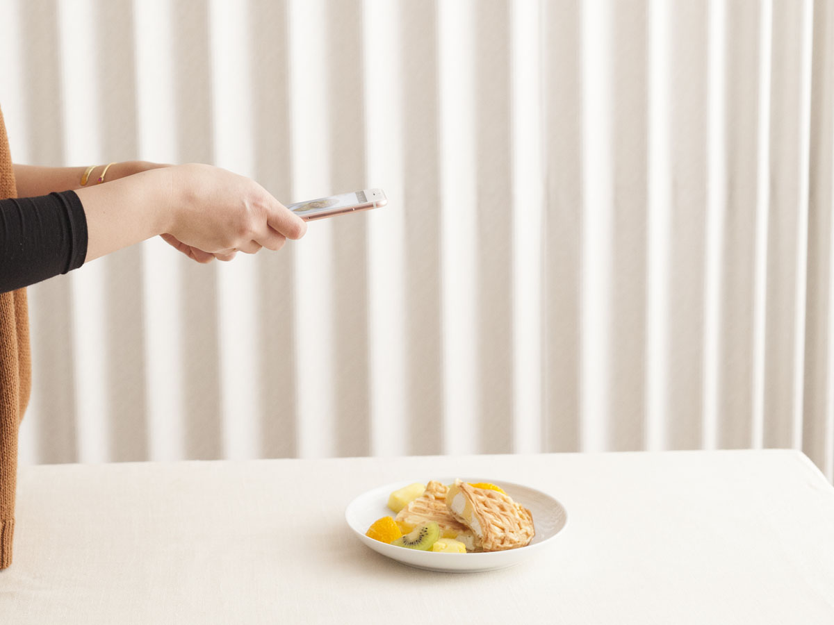 「まずお皿を、iPhoneの画面上で見て中央にくるように置きます。そしてiPhoneを中央から横に少し動かして、お皿の端が切れるように撮影してみてください。そうすると雰囲気が出ますよ」