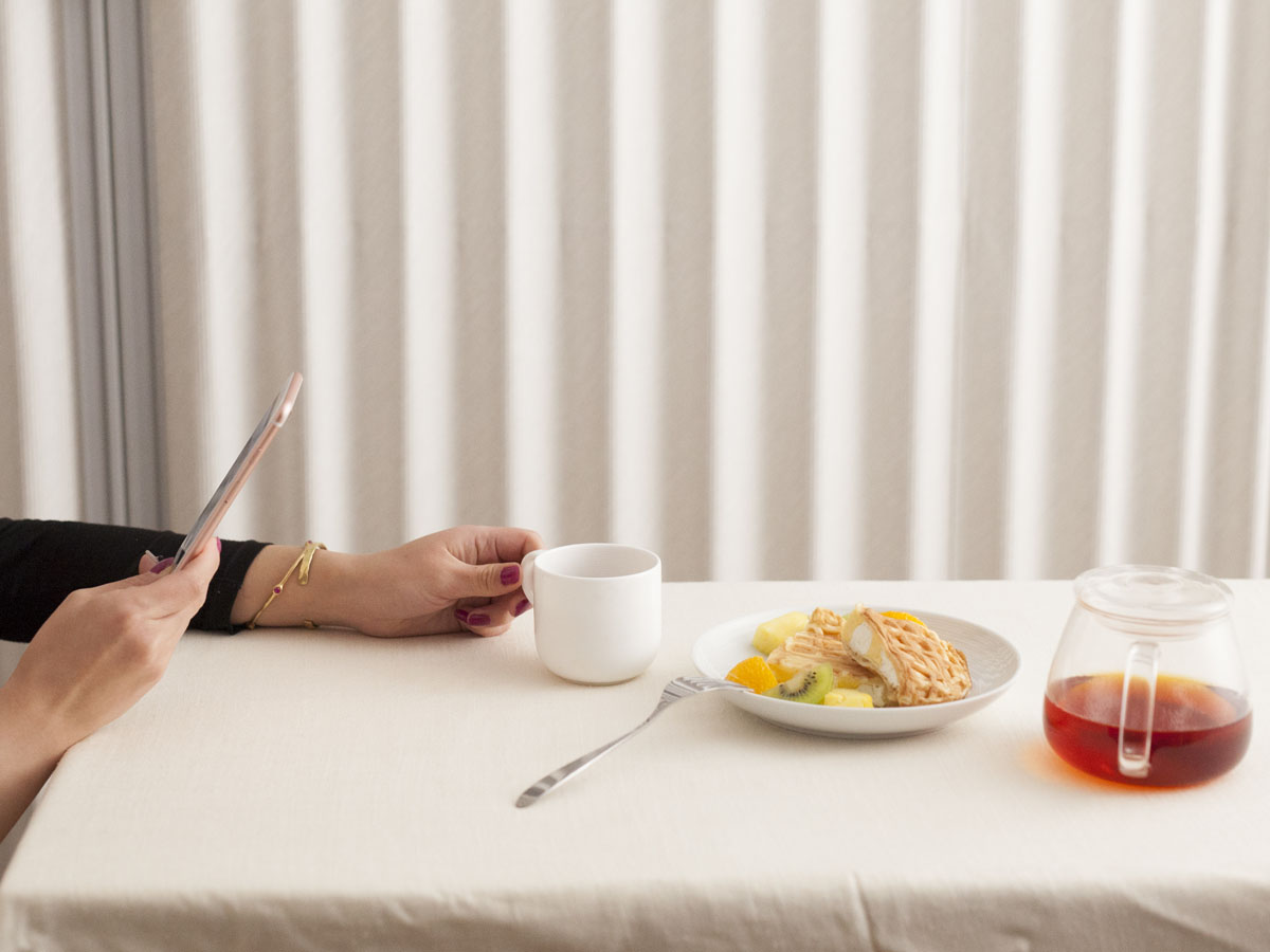 ここからはちょっと応用編です。テーブルにある小物を使って撮影してみることになりました。小物はティーカップなど身近なものでOKです。今回はティーカップ、ティーポット、フォークの3つを使いました。