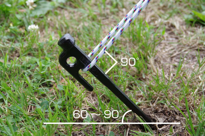 ガイラインとペグの角度は直角(90度)に。ペグは、テントと逆の方向に地面と60度の角度になるように傾ける。できれば、ガイラインがより地面に近いところになるまで打ち込みたい。