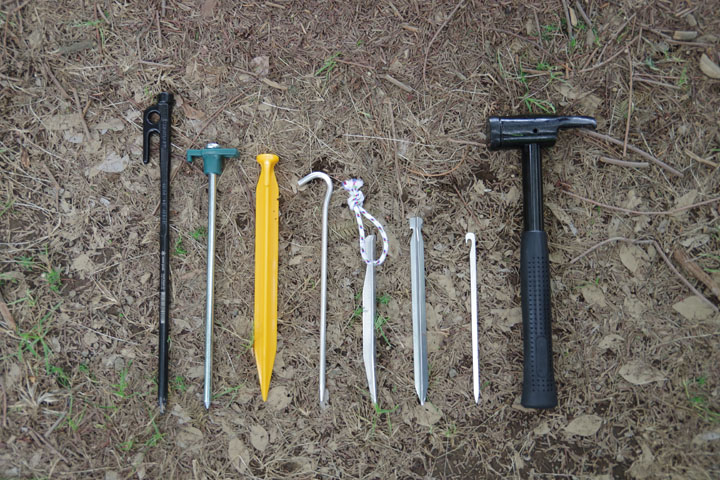 ペグはできれば設営場所の地面の硬さに応じて使い分けたい。ただし、表面はやわらかくても中に石が多く、途中から急に刺さらなくなるといったことも起こりうる。