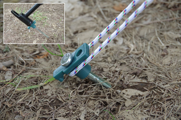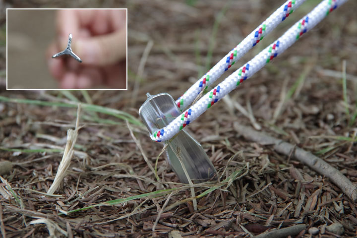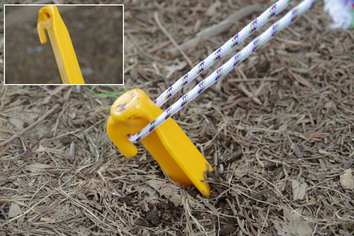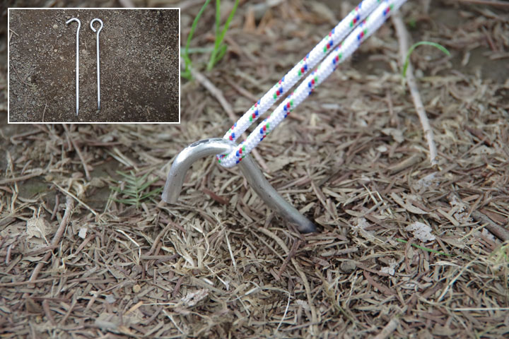 スチール製の釘にプラスチックのフックが付いたような形をしている。強度はあるので、まっすぐハンマーで打ち込めば、硬い地面にも難なく刺さっていく。値段も安く使い勝手は抜群だが、抜くときに気を付けないと、フック部分が壊れることが多い。