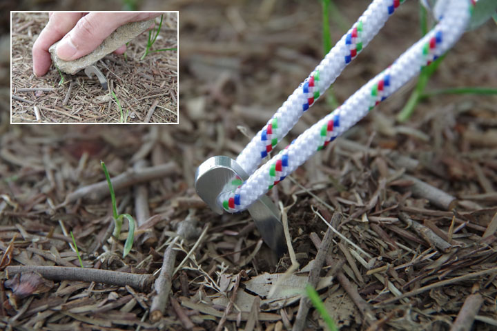 ペグを打つときは、必ずペグに向かって真っ直ぐ打つようにする。そうしないと、素材がアルミの場合は簡単に曲がってしまう。