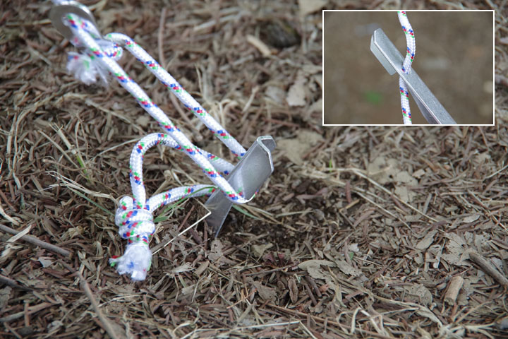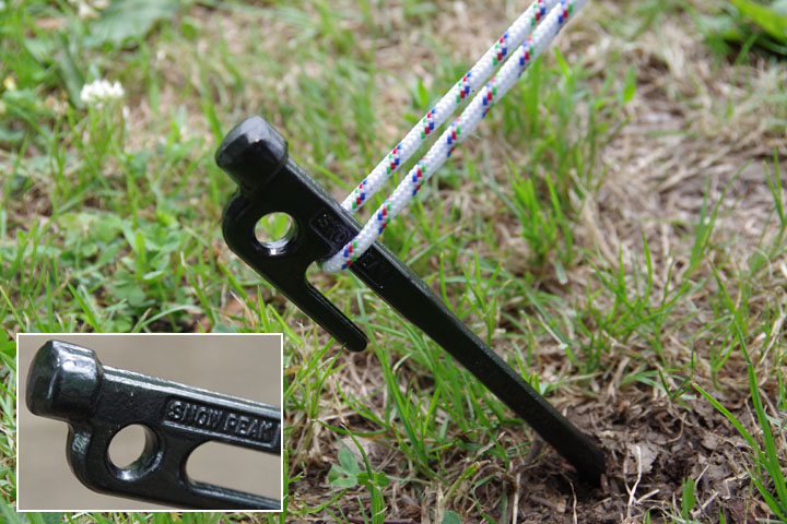 プラペグと同じく付属品としてテントやタープに付いている場合が多い。素材はさまざまで、スチール製の場合は貫通力が高く万能。アルミ製は軽いが曲がりやすいため、慎重に打つ必要がある。また、フック部分がほぼ円形になっているモノもあるが、ある程度開いているモノの方が、輪にしたガイラインを引っ掛けやすい。打ち込む際にまっすぐ力を掛けないと、曲げてしまうことが多い点も注意が必要だ。