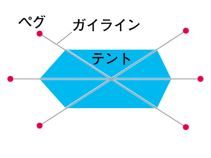 ガイライン(張り綱)は、対面と直線になるように延ばし、ペグで地面に固定する。