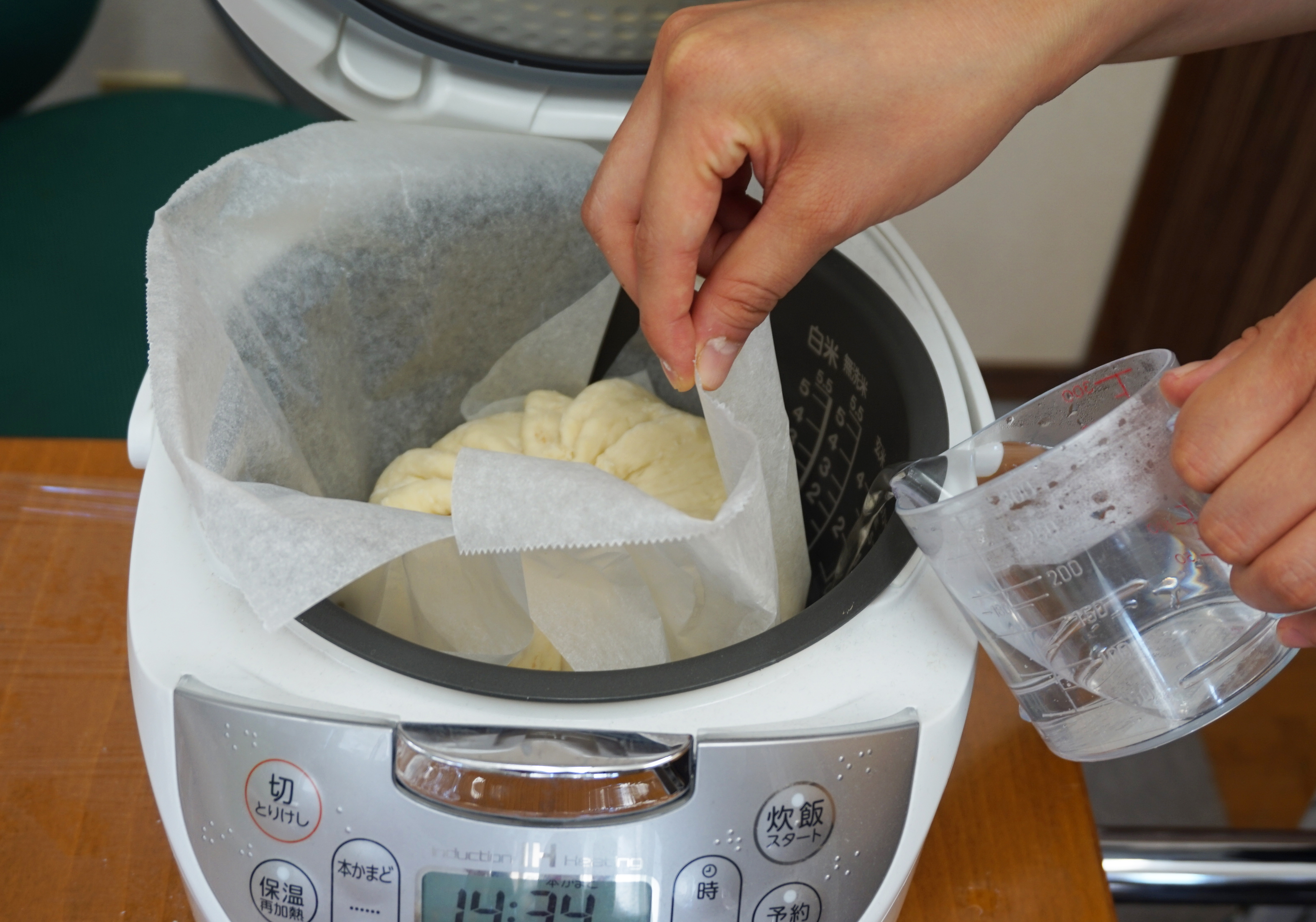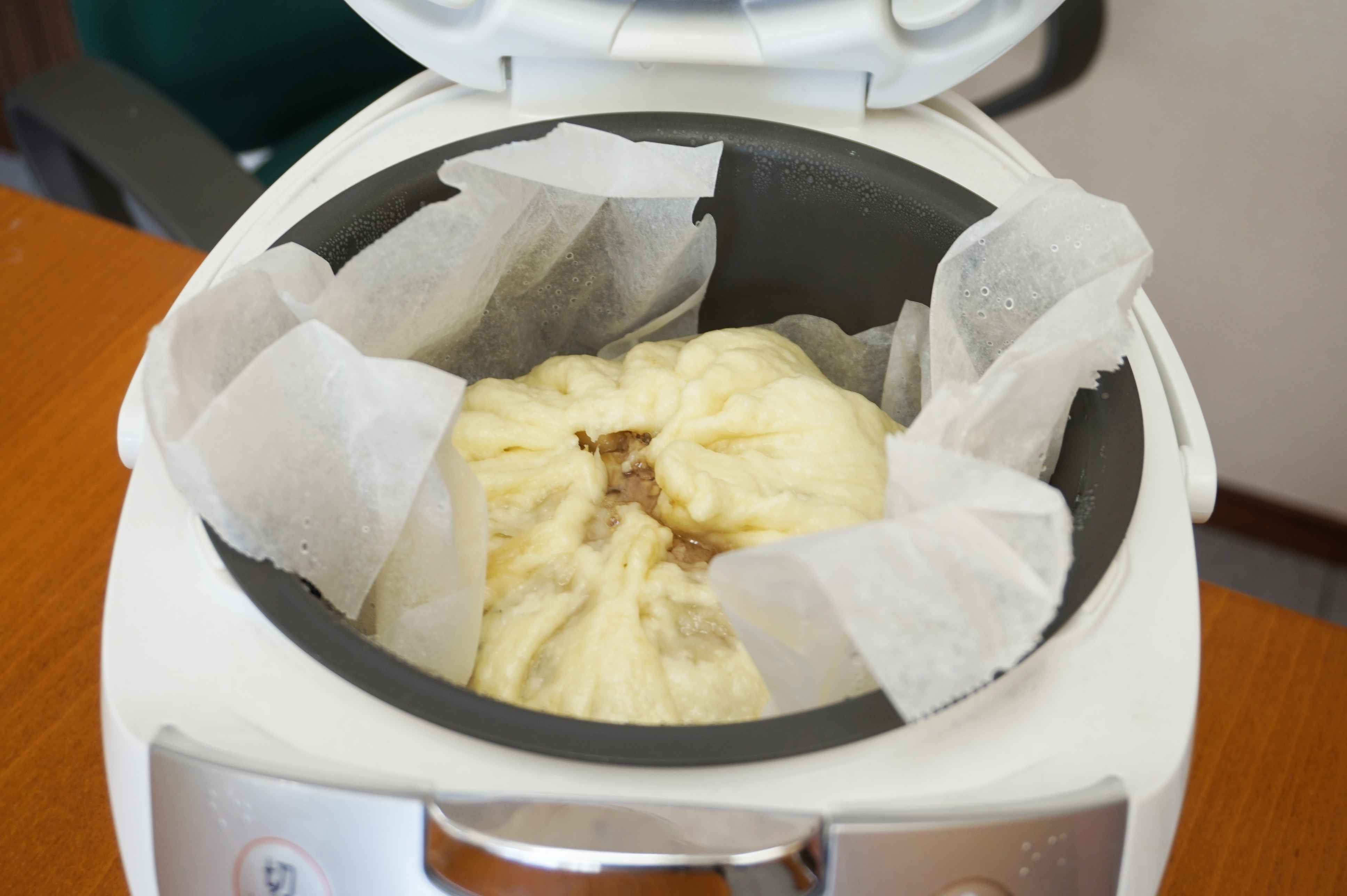 (1)炊飯器にクッキングシートを敷いて、肉まんを投入。