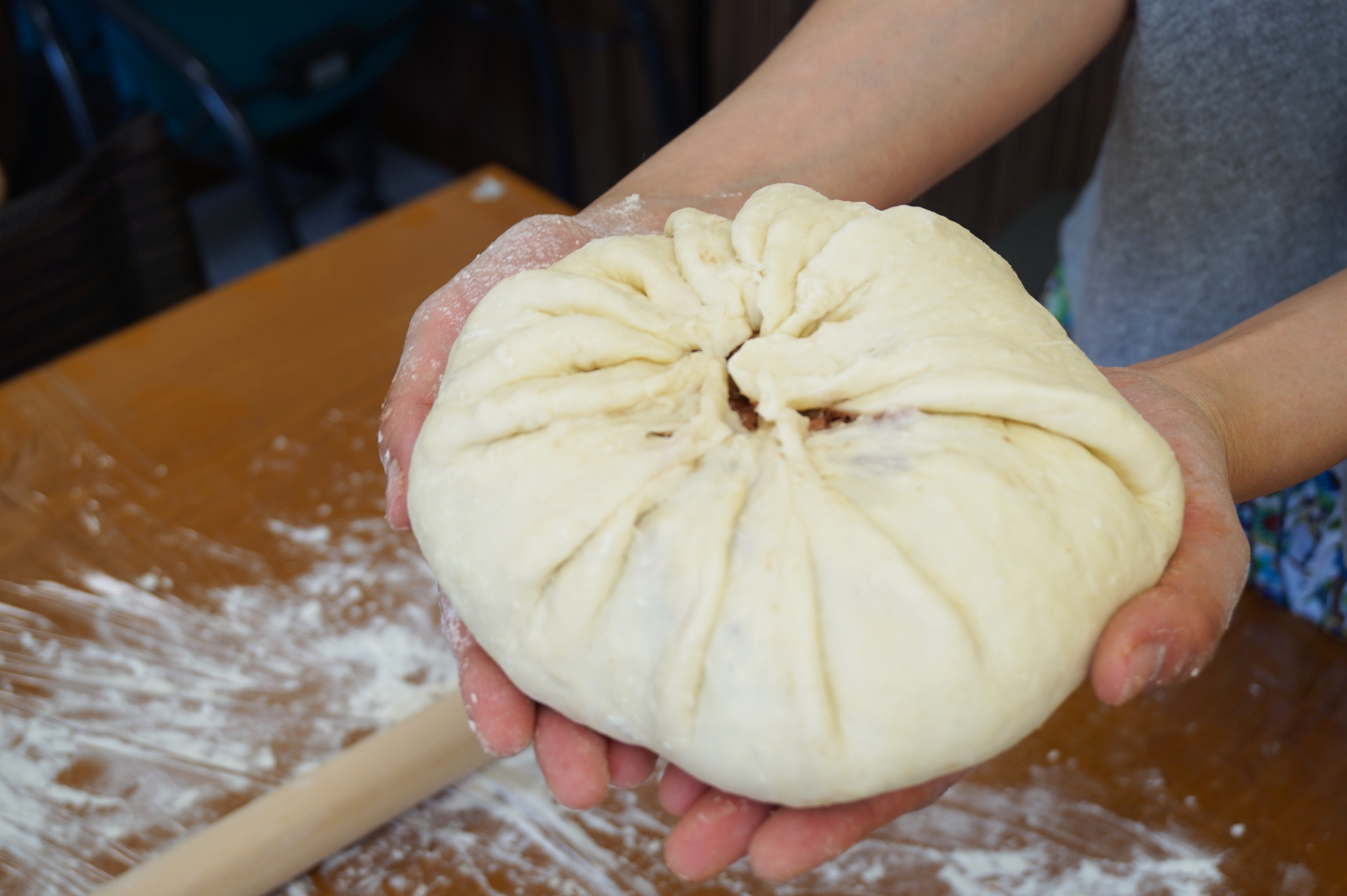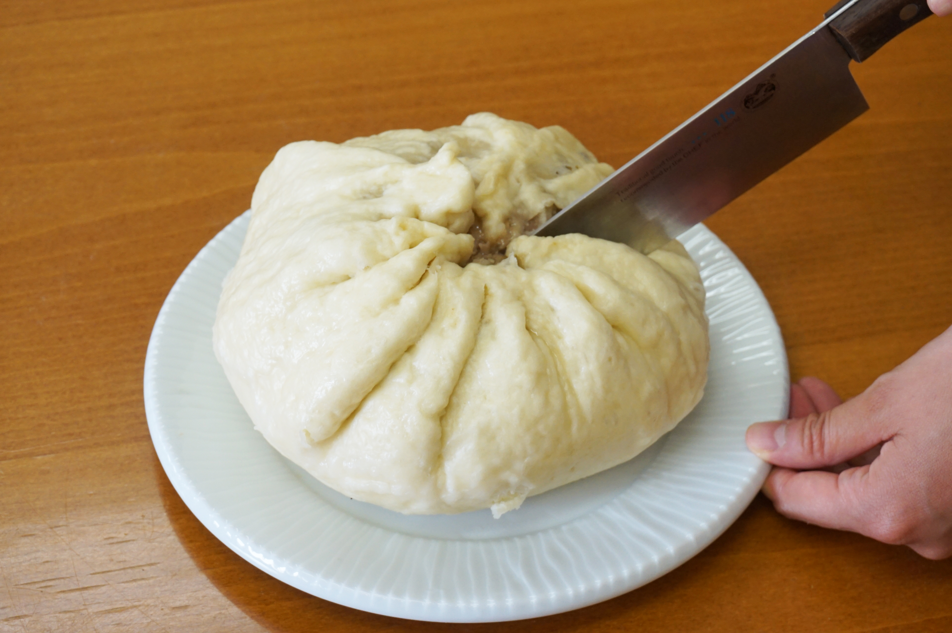 お皿いっぱいの巨大肉まん。ケーキ入刀ならぬ、肉まん入刀。