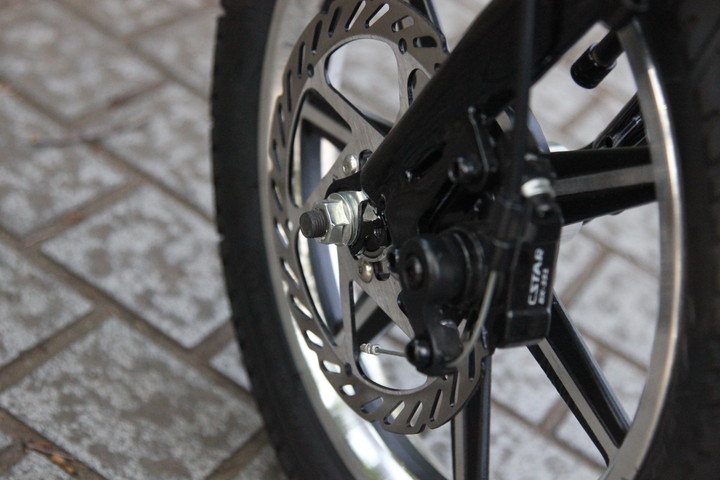 ▲フロントのディスブレーキは、制動力が高く。しっかりスピードのコントロールができる