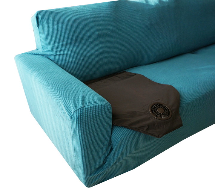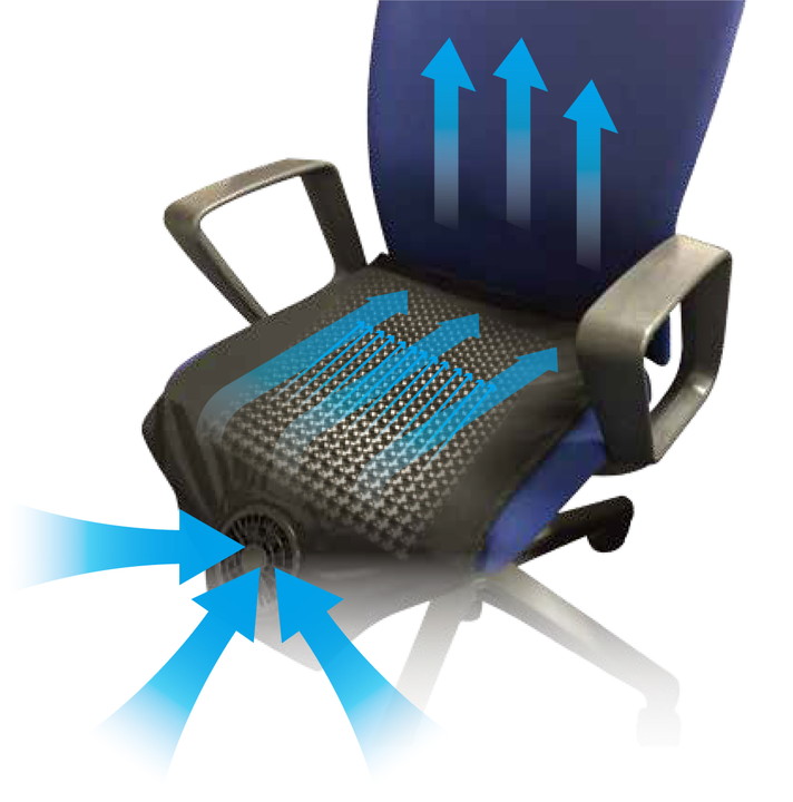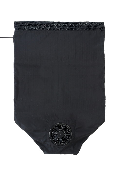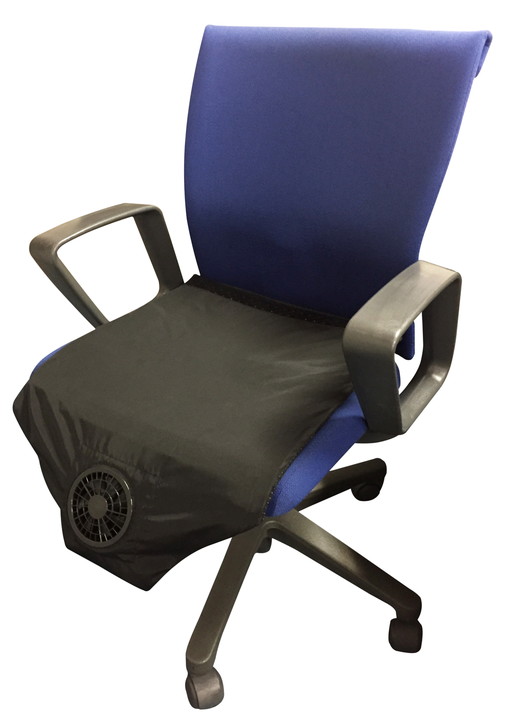 「ROOMMATEクールシートエアロファン」はUSBで電源供給し、前方のエアー吸込部から空気を集め、シートの中から後方に向けて放出。空気の流れにより、着座部や背面の熱気を緩和するシートタイプの簡易クーラーです。