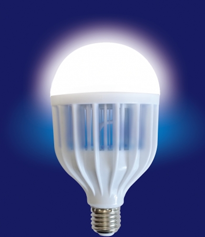 イーバランスから登場した「ROOMMATE LED電球 スーパームシキラー EB-RM18A」(オープンプライス/2017年6月発売)は、電撃殺虫灯を内蔵したLEDライト。蚊など虫が好むブルーライトでおびき寄せ、中に入ったところで瞬間的に感電死させます。