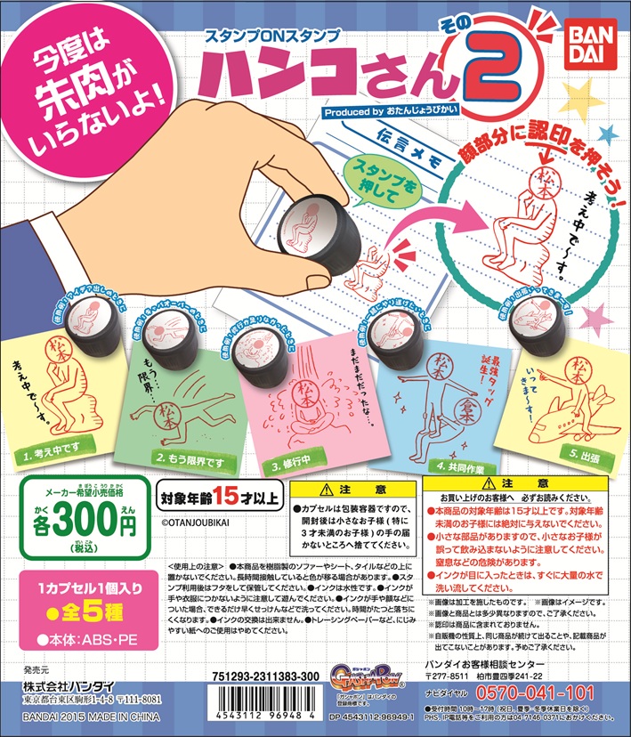 「スタンプONスタンプ ハンコさん2 Produced by おたんじょうびかい」だ。1回300円・全5種類、全国のおもちゃ売場、量販店などに設置の「ガシャポン」で7月中旬より発売中だ。使い方は簡単、先に「ハンコさん2」を押したあと、空白部分に自分のネーム印を押すのみ。たったこれだけで、ネーム印があなたに代わって気持ちを代弁してくれる(気がする)!
