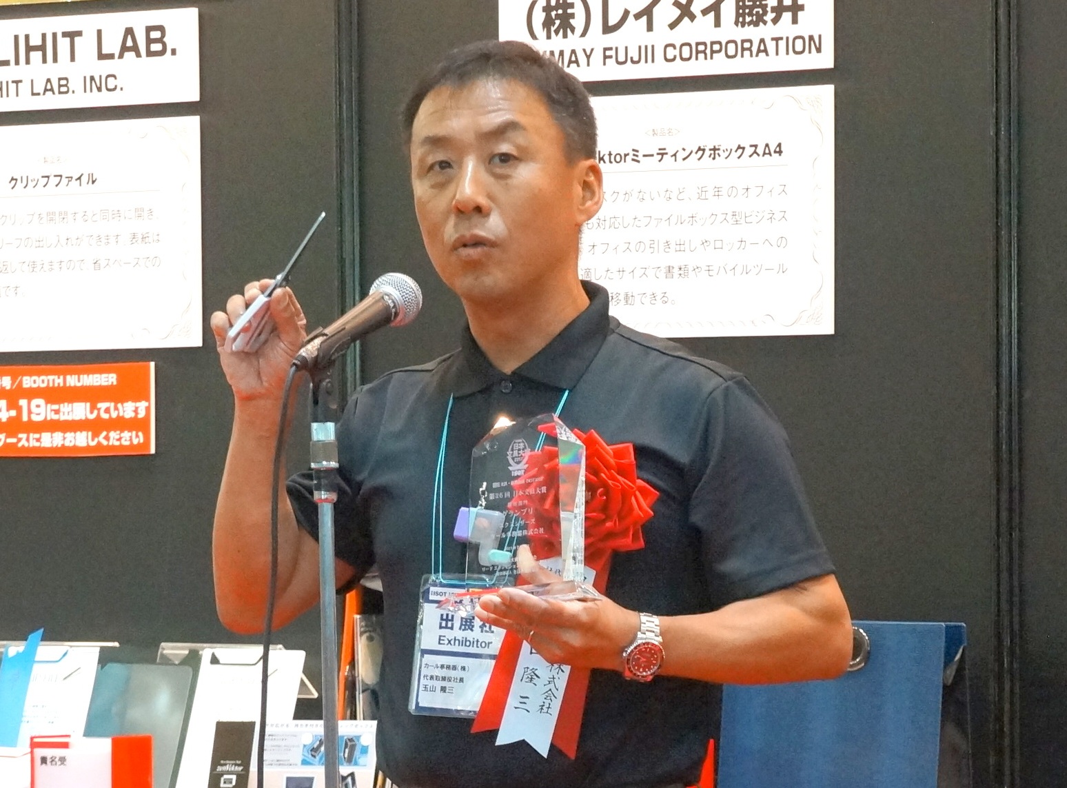 機能部門のグランプリは、カール事務器の「エクスシザース」が受賞しました。モノを切るのではなく、切り“落とす”をコンセプトに開発された本製品。グランプリ受賞を受け、代表取締役の玉山隆三氏は、同社の製品開発について「切ることを極限まで突き詰めたら何ができるか、という点を日夜考えている」と語りました。