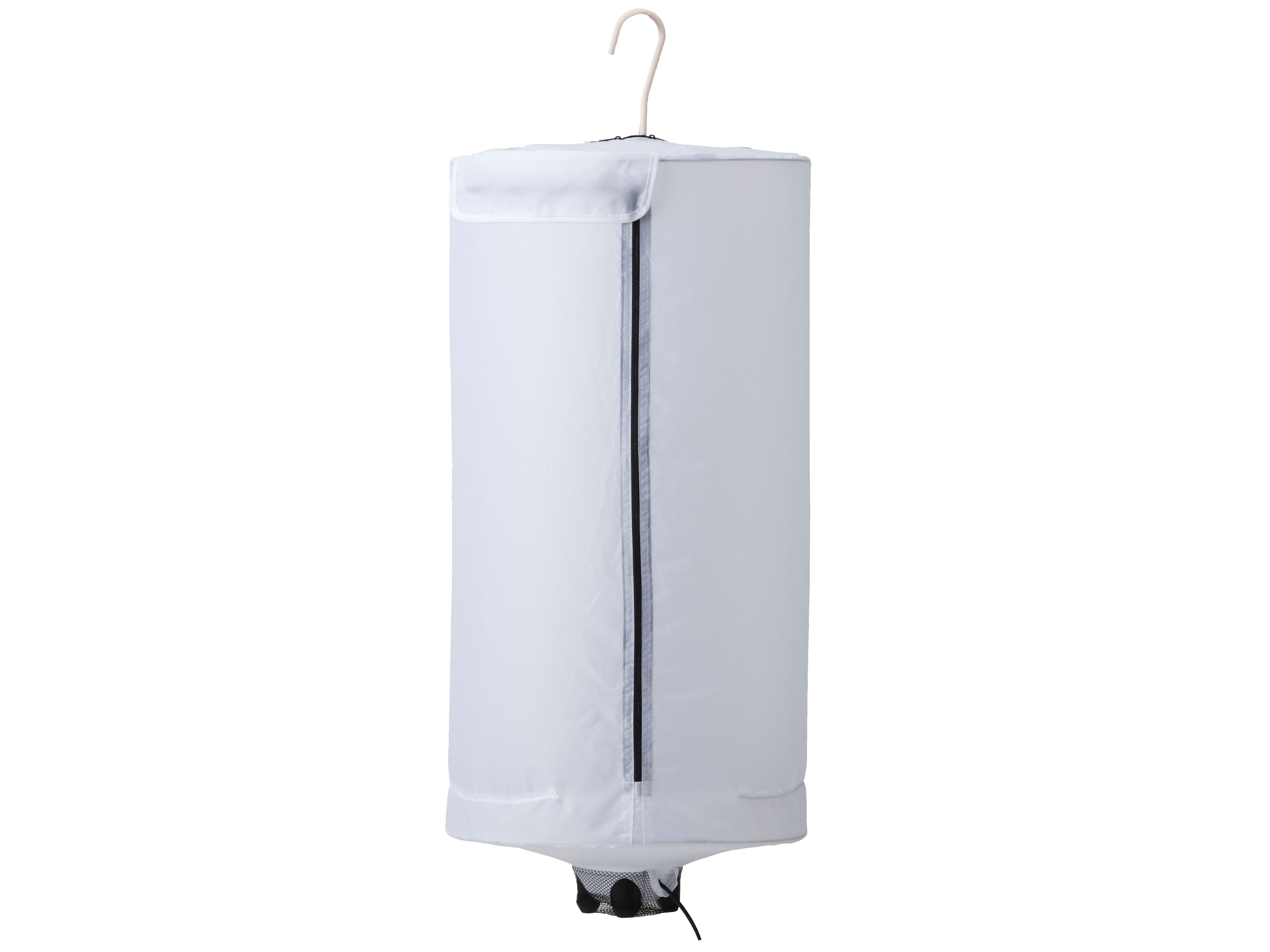 使い方は、付属のアタッチメントに干した洗濯物にカバーをかけて本体をセットし、電源を入れるだけ。本体に内蔵されたヒーターとファンの力で、コンパクトながらパワフルに急速乾燥します。衣類用乾燥カバーは直径42cmの円筒形で、シャツなら5~6着を乾燥できるサイズ。たとえばシャツ2枚、下着2枚、靴下2足ほどの容量なら約4時間程度でふんわり乾燥するとのこと。