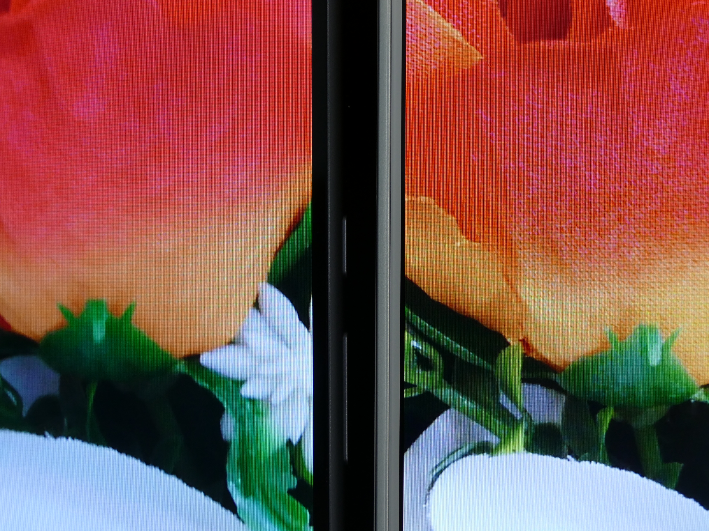 ▲左が従来機、右がM04。造花を撮影して拡大した部分。M04の方が、ディティールが精細で、色彩にも差がある