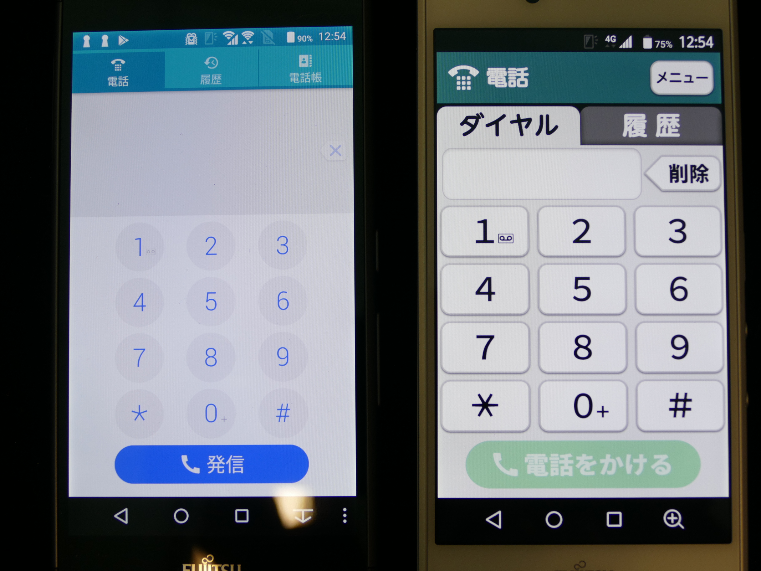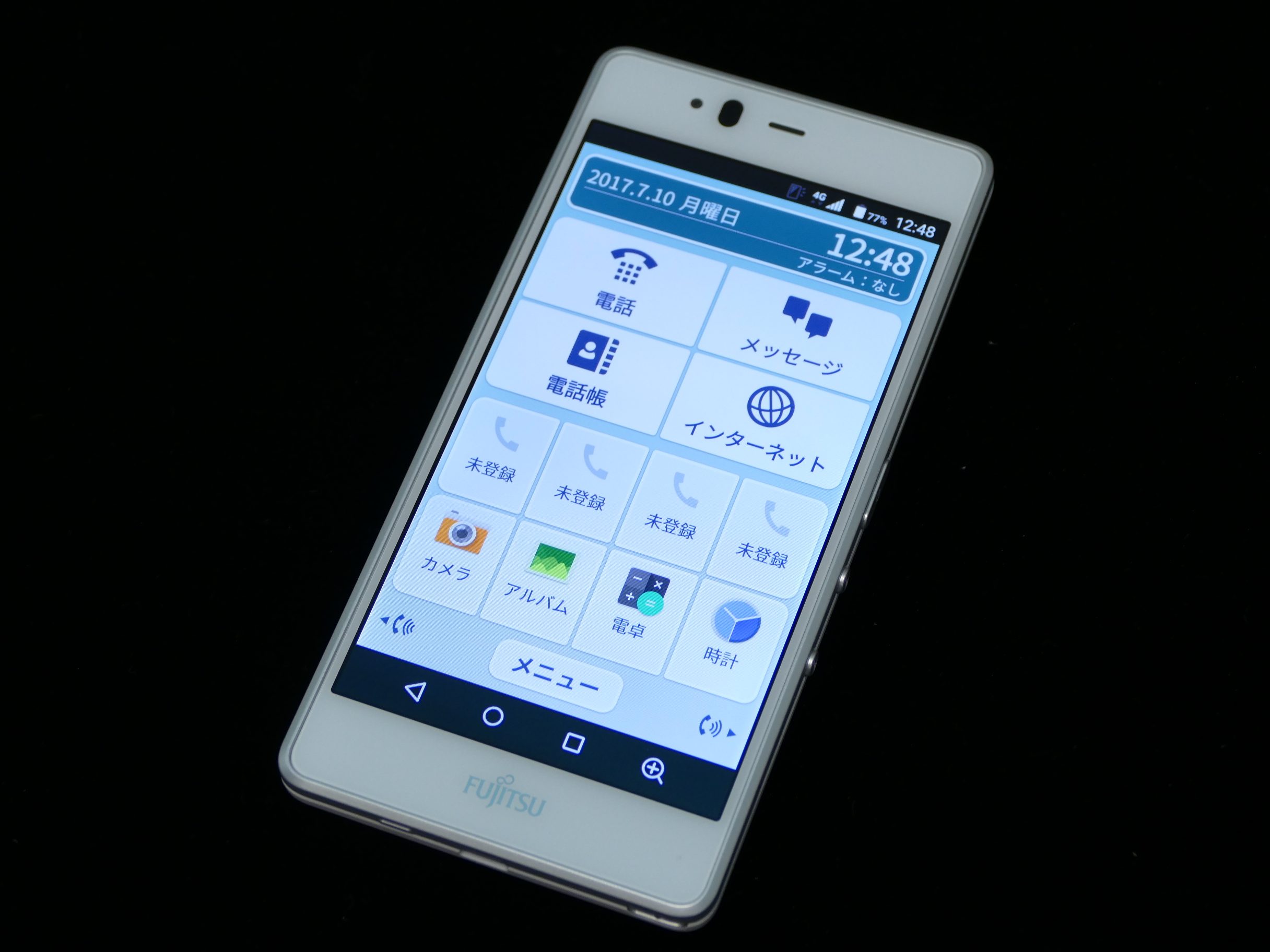 続いて、ソフトウェアの変更点について。まず、通常のホーム画面の他に、富士通独自のUI「かんたんセット」が選べることがトピック。こちらのホーム画面には、基本的なアプリが大きく表示されるほか、「電話」「メッセージ」などのアプリで文字のコントラストやフォントが見やすく調整されています。