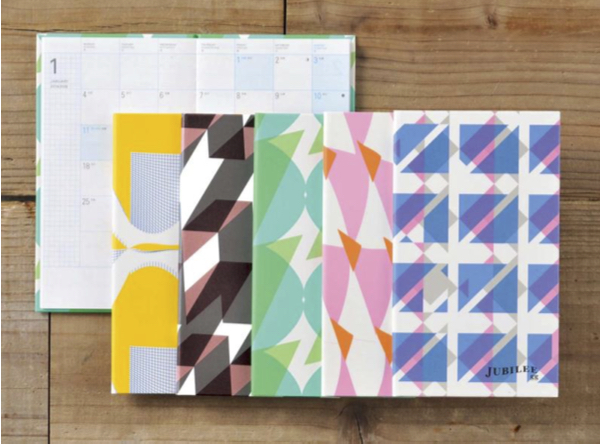 動きのあるパターンと鮮やかなカラーリングの幾何学柄の表紙の5色展開。H165mm×W95mm×D6mm。