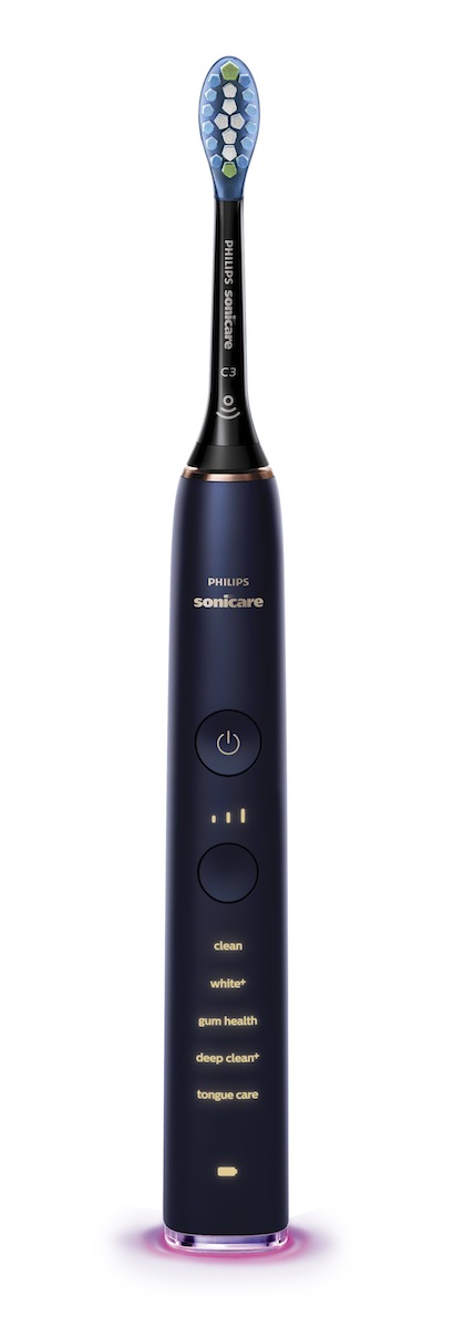 フィリップスから登場するのは「ソニッケアー ダイヤモンド クリーンスマート」(オープン価格/9月1日発売)。歯垢除去、歯ぐきケア、ステイン除去、舌ケア、それぞれに特化した4本のブラシヘッドがセットになった電動歯ブラシです。このブラシヘッドがなかなかのスグレモノ。マイクロチップが内蔵されており、それぞれに最適なモードと強さを自動的に設定してくれます。
