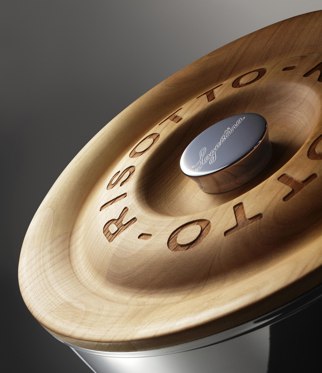 蓋部分はステンレスにチェリーウッドを重ねた二重構造。天然素材は、家庭的な温かみを添えるだけではなく、できあがったリゾットを熱々のままキープさせる保温効果も。またテーブルでサーブする際には、鍋敷きとしての役割も果たします。