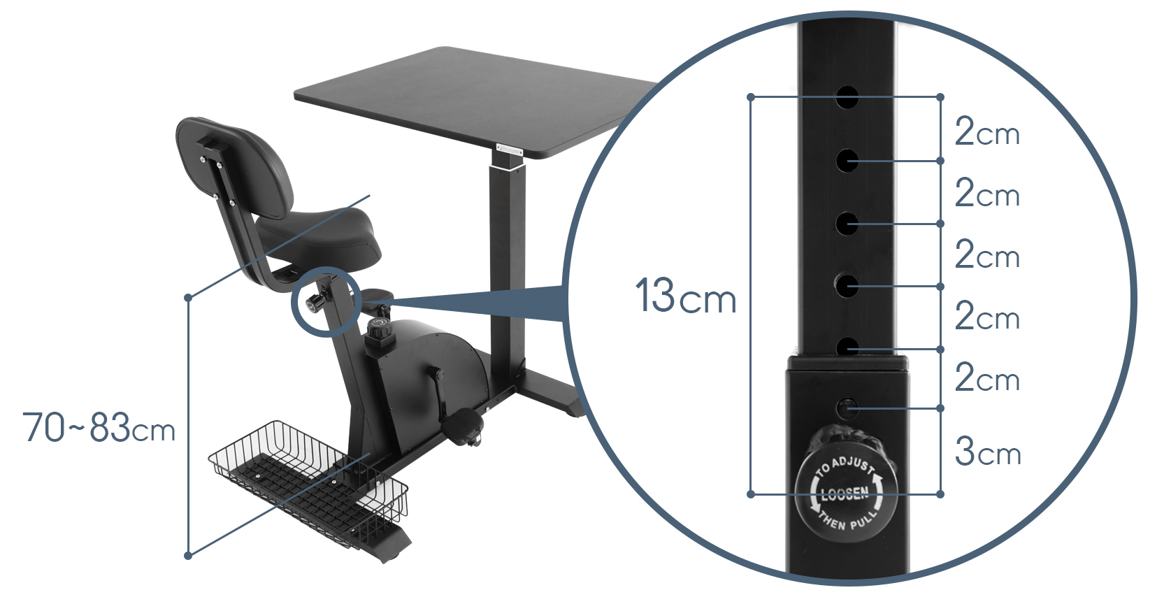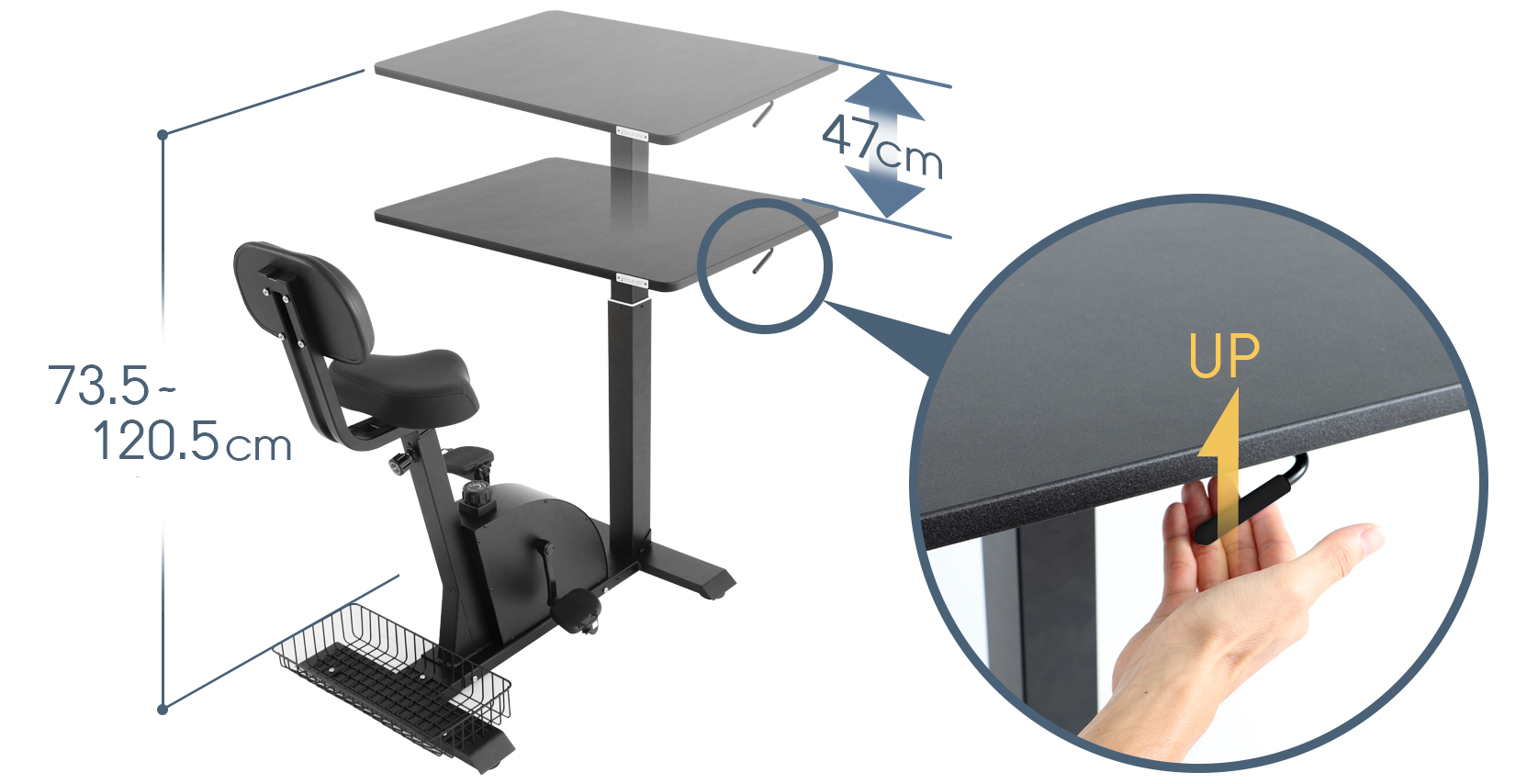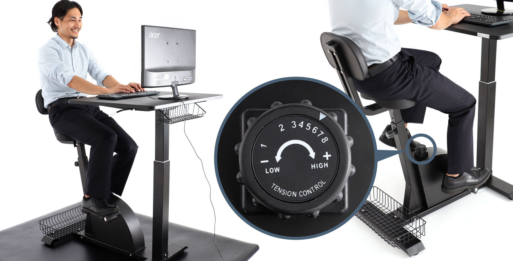 天板サイズは78×50cmとワーキングデスクとしてはやや小ぶりですが、PCと資料を手元に広げる程度なら十分なスペース。バイクの負荷は8段階で調節でき、静音設計で周囲を気にすることなく使えます。