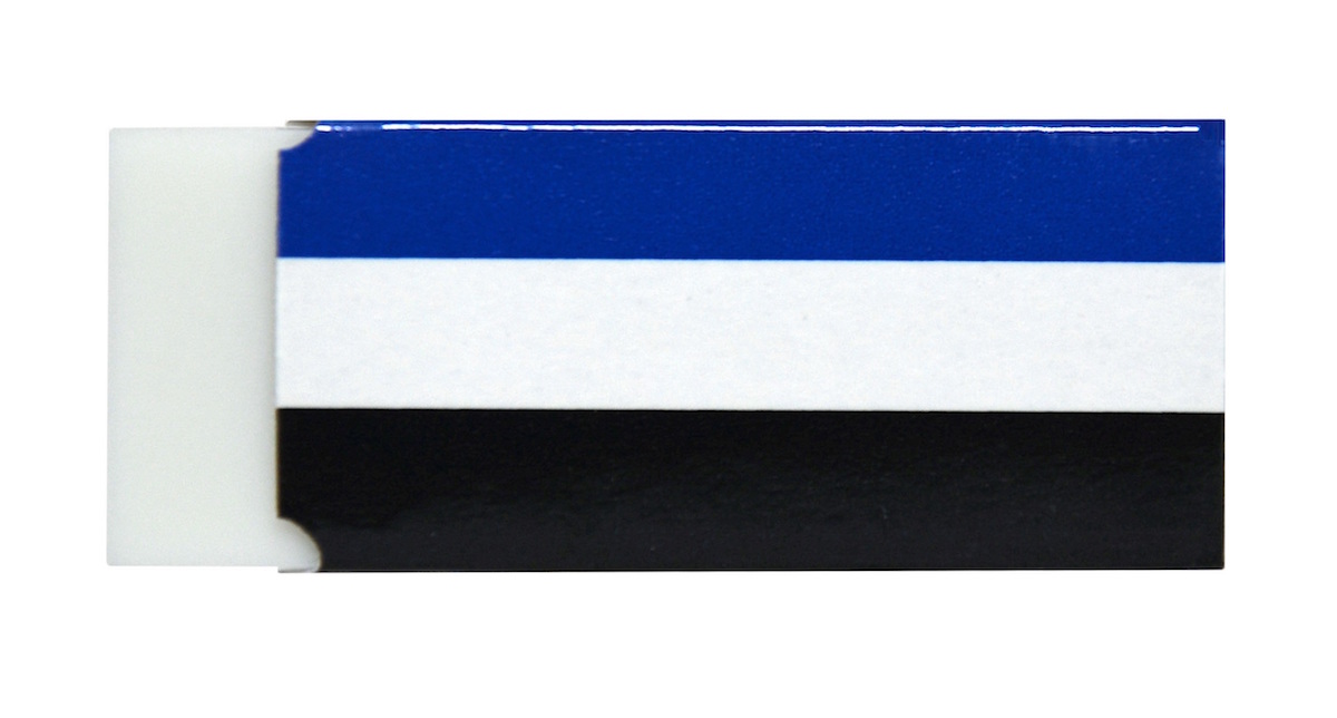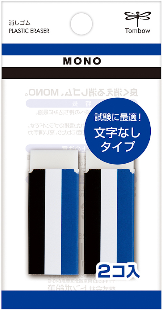 消しゴム本体は同社型番PE-01Aの「MONO消しゴム」と同等ですが、スリーブは青白黒の3カラーをあしらうのみ。商品名やメーカー名、型番、使用上の注意などもふくめた一切の印刷を省いています。
