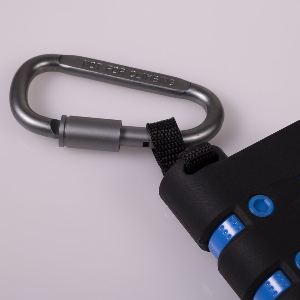 本体にはワンボタンで点灯するLEDランプを内蔵しているので、暗所や夜間での光源にもなります。フックやベルトにかけられるカラビナ付きで、用途に合わせてさまざまな場所にぶら下げられるのも便利。