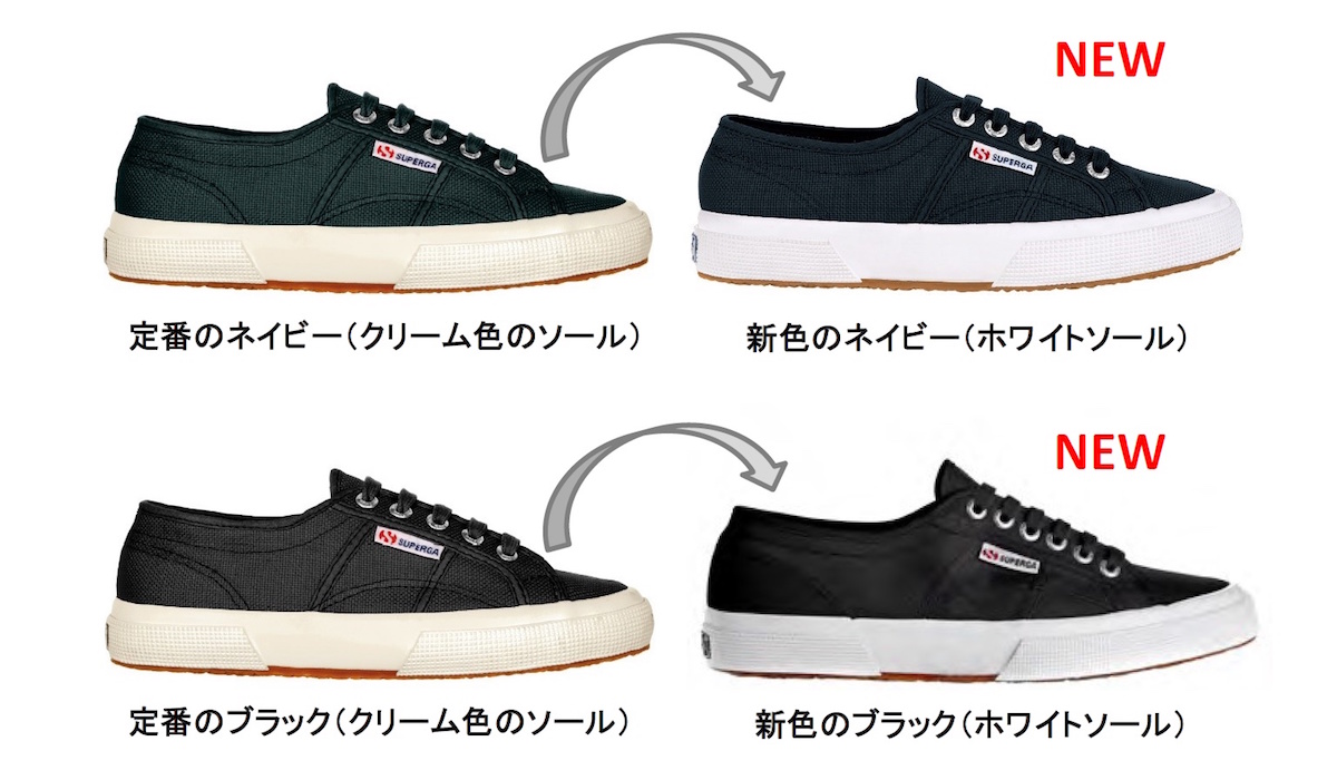 従来、ネイビーとブラックのソールにはクリーム色なのですが、新作は真っ白のソールになっています。ソールの色を変えてもアッパーが同じなら同類では? と思うかもしれませんが、新作はさわやかな印象が強まり、アッパーのネイビーとブラックがぐっとクリアに見えます。ソールのカラー1つでぐっと印象が変わるって、面白いですよね。クリーム色のソール、真っ白のソール、あえて2つを揃えて違いを楽しむのもいいかも!