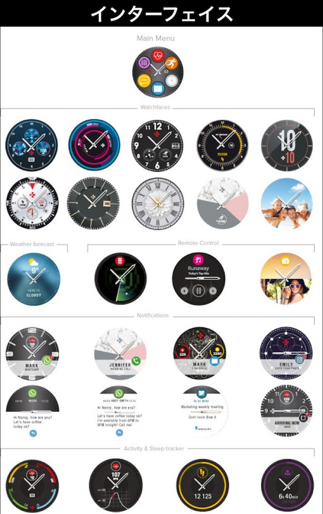 フルカラーの丸型タッチスクリーンは指先による直感的な操作が可能で、メニューの選択・決定は時計本体の外縁部にあるスマートクラウン(竜頭)で行います。プリインストールされたアプリや各種SNSからの通知、光学式心拍センサーや歩数計、消費カロリーといった体調管理、日々のスケジュール管理から連動したスマホへの遠隔操作などなど、スマートウォッチならではの多彩な機能を備えています(対応OSはiOS8.0以上、Android4.3以上・Bluetooth対応端末で利用可能)。