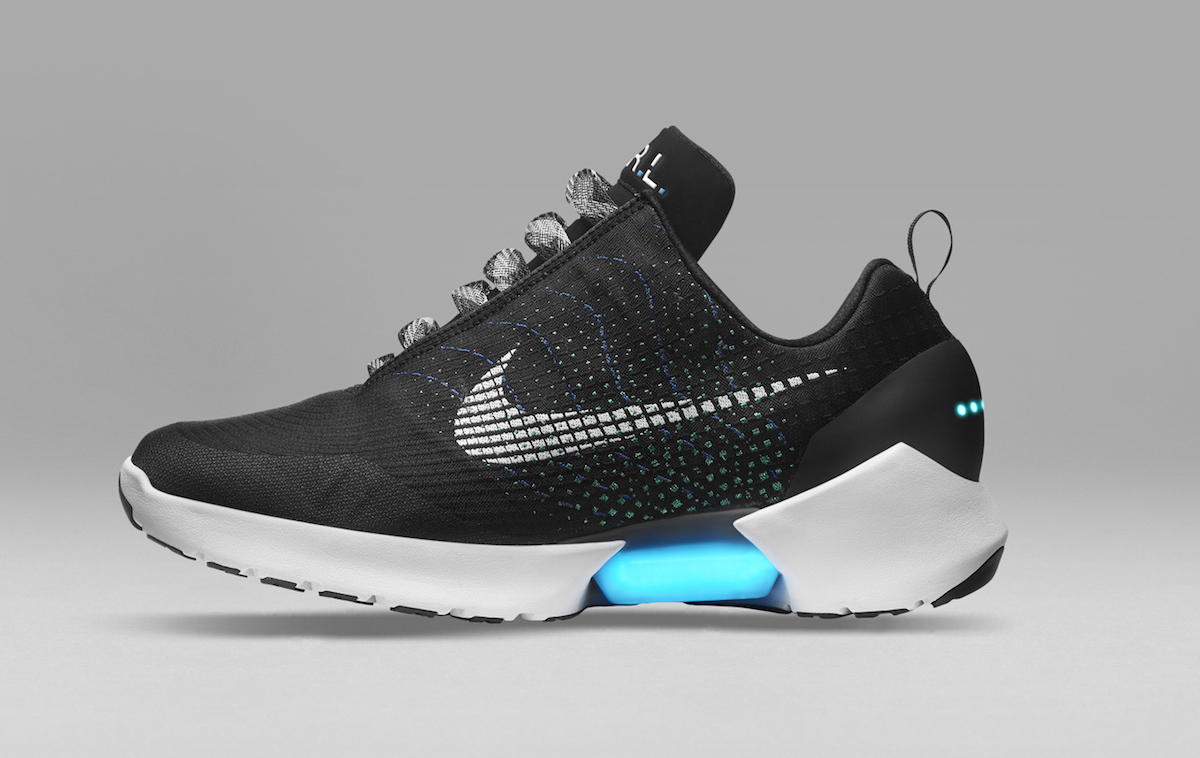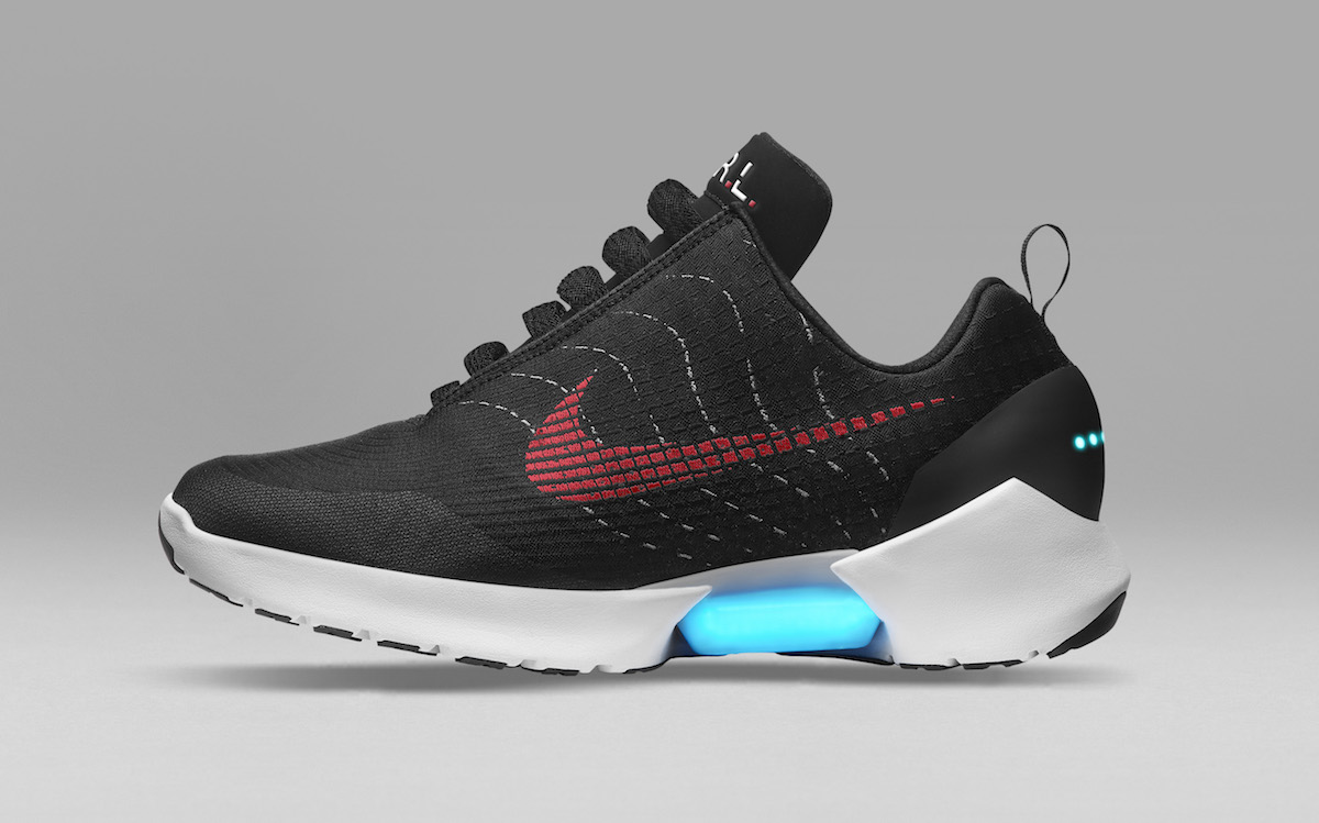 「ナイキ ハイパーアダプト 1.0」は、ナイキの最新のフットウェア技術、アダプティブ・レーシングを使った初めてのフットウェア。ナイキのデザイナーであるティンカー・ハットフィールド氏と、シニア・イノベーターのティファニー・ビアーズ氏が研究を重ねて生み出した技術で、2015年に映画の中で披露された自動で紐が閉まるシューズが、ついに市販となる。