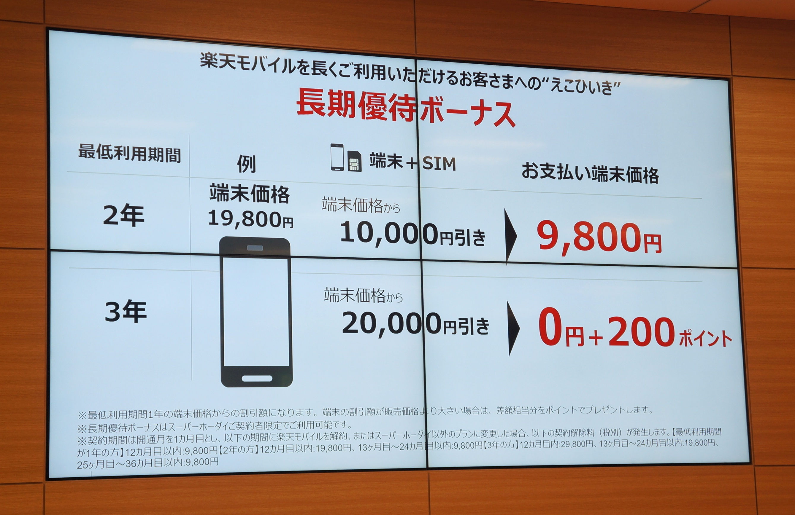 楽天モバイルを長く利用すると、優待ボーナスを受け取れます。プランの最低利用期間に応じ、端末価格が割引になったり、楽天ポイントが付与されたり、といったサービスを受けられるのです。