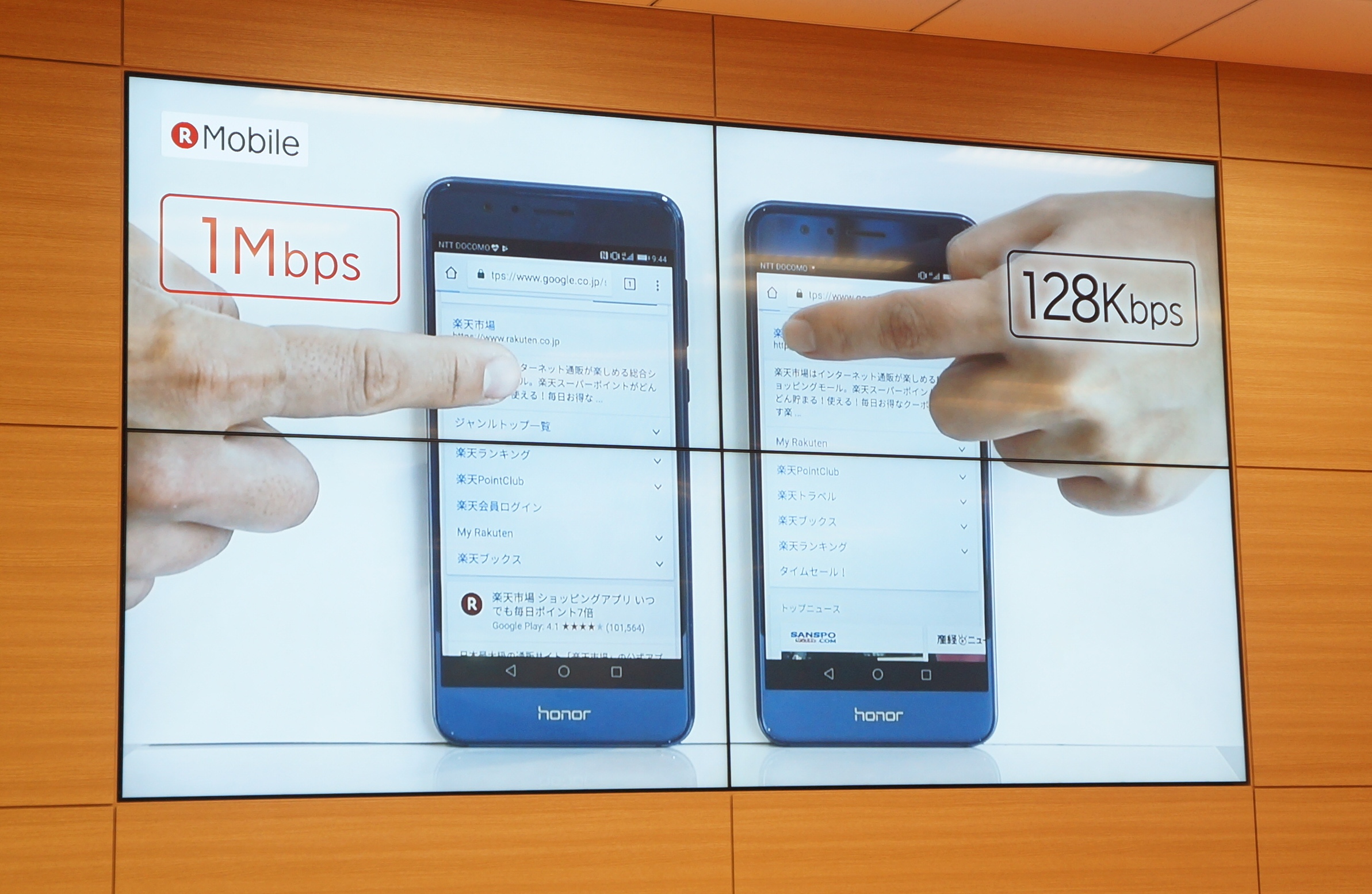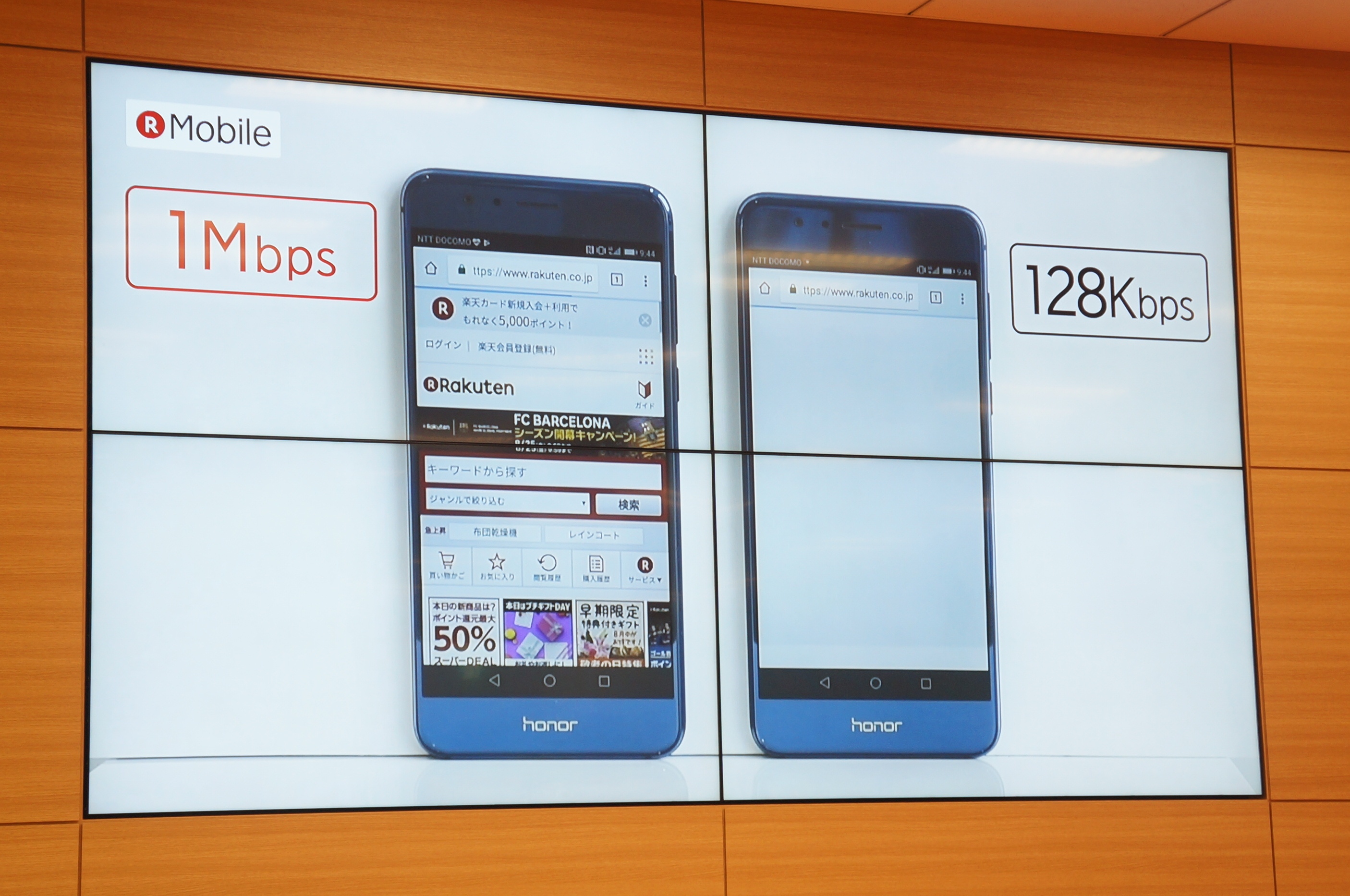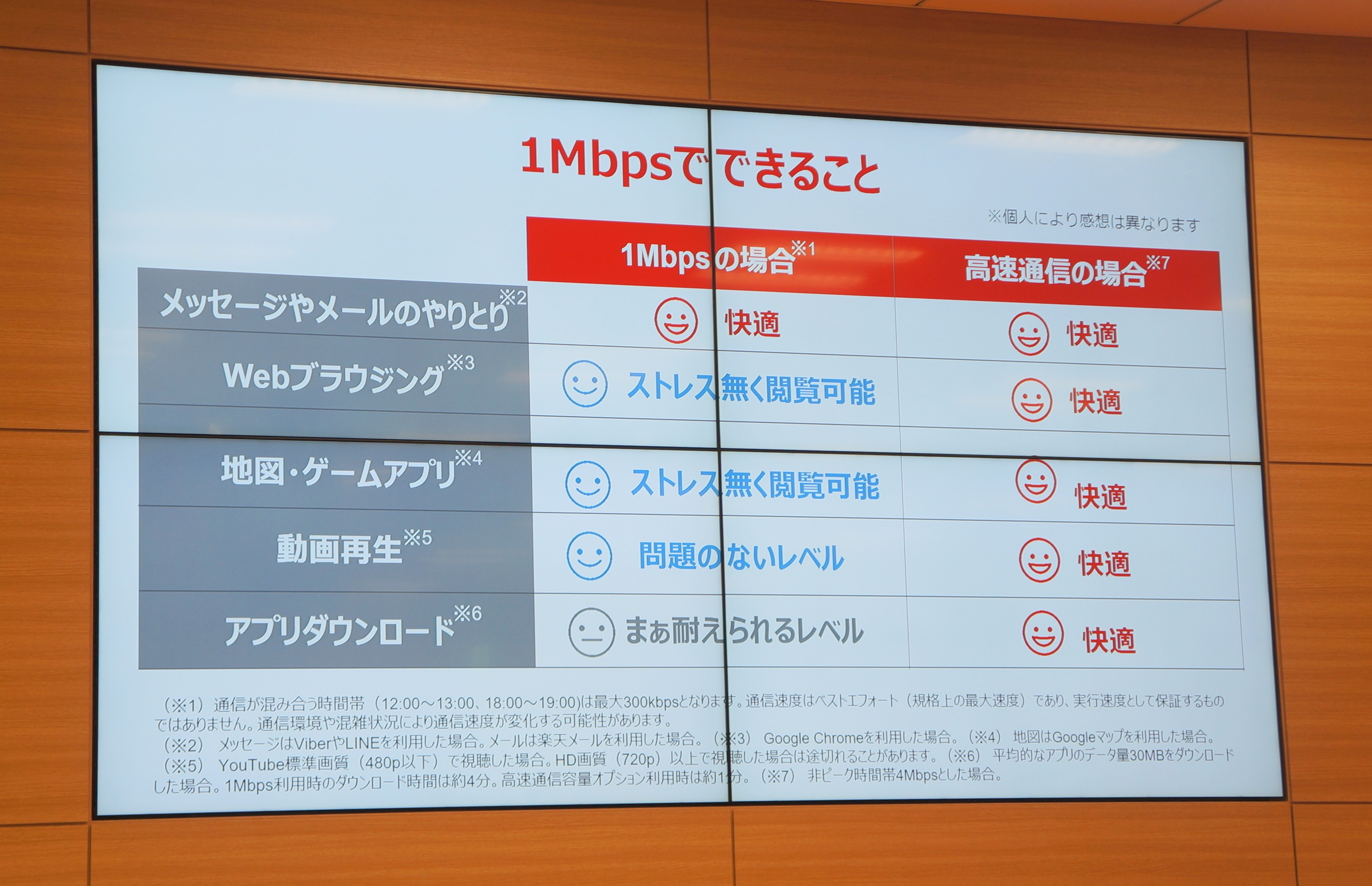 ところで、「スーパーホーダイ」が謳う「最大1Mbpsのデータ通信」って実際にどれくらいの速さなのでしょう。発表会では1Mbpsと128kbps(大手キャリアで速度制限がかかった場合の通信速度)の比較動画が公開されました。