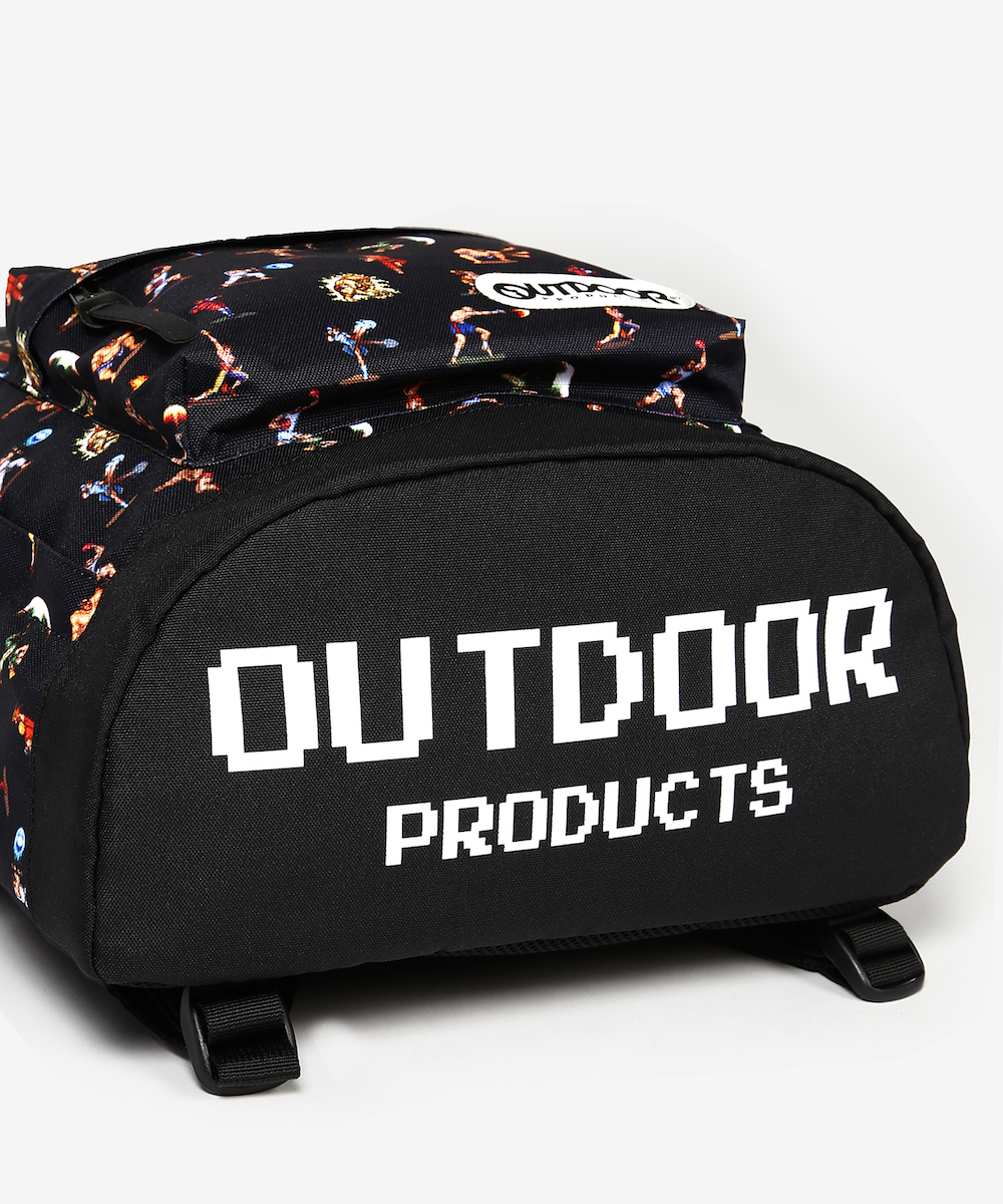 背面はメッシュ素材で蒸れにくく、バッグの底にはゲーム調の書体で「OUTDOOR PRODUCTS」のロゴが入っています。