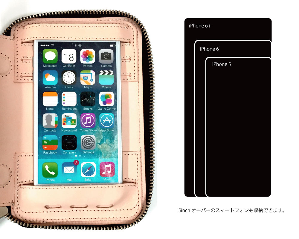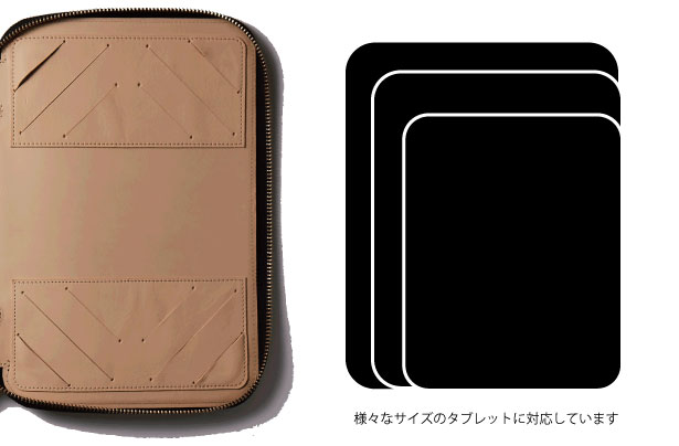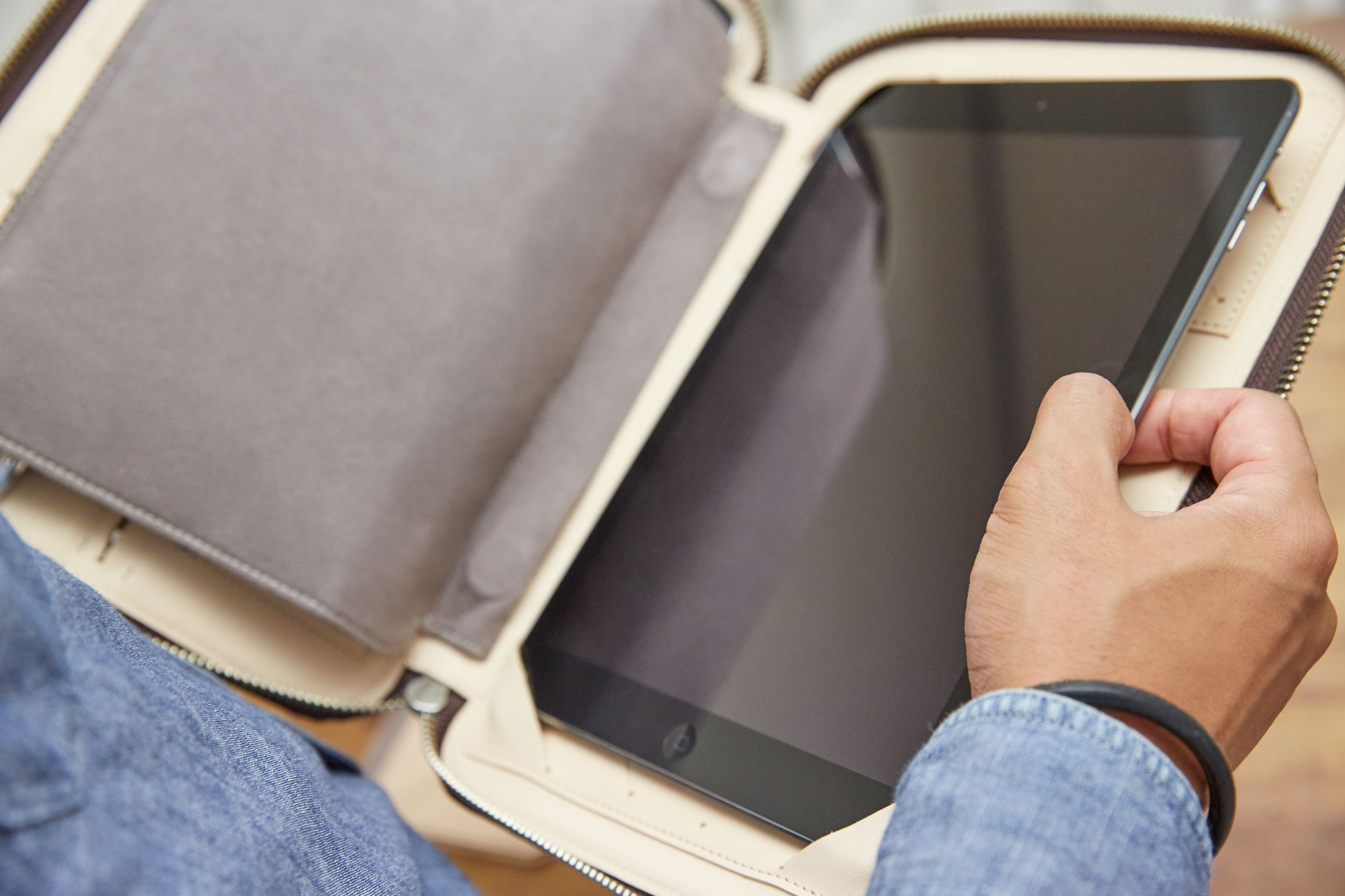 必要なものはこれひとつに入ることに加え、注目ポイントはタブレット収納部。切り込みが複数設けられていて、iPad、iPad mini、Xperiaなど、幅広い機種に対応しているため、将来機種変更をしても使い続けられるのが嬉しい。