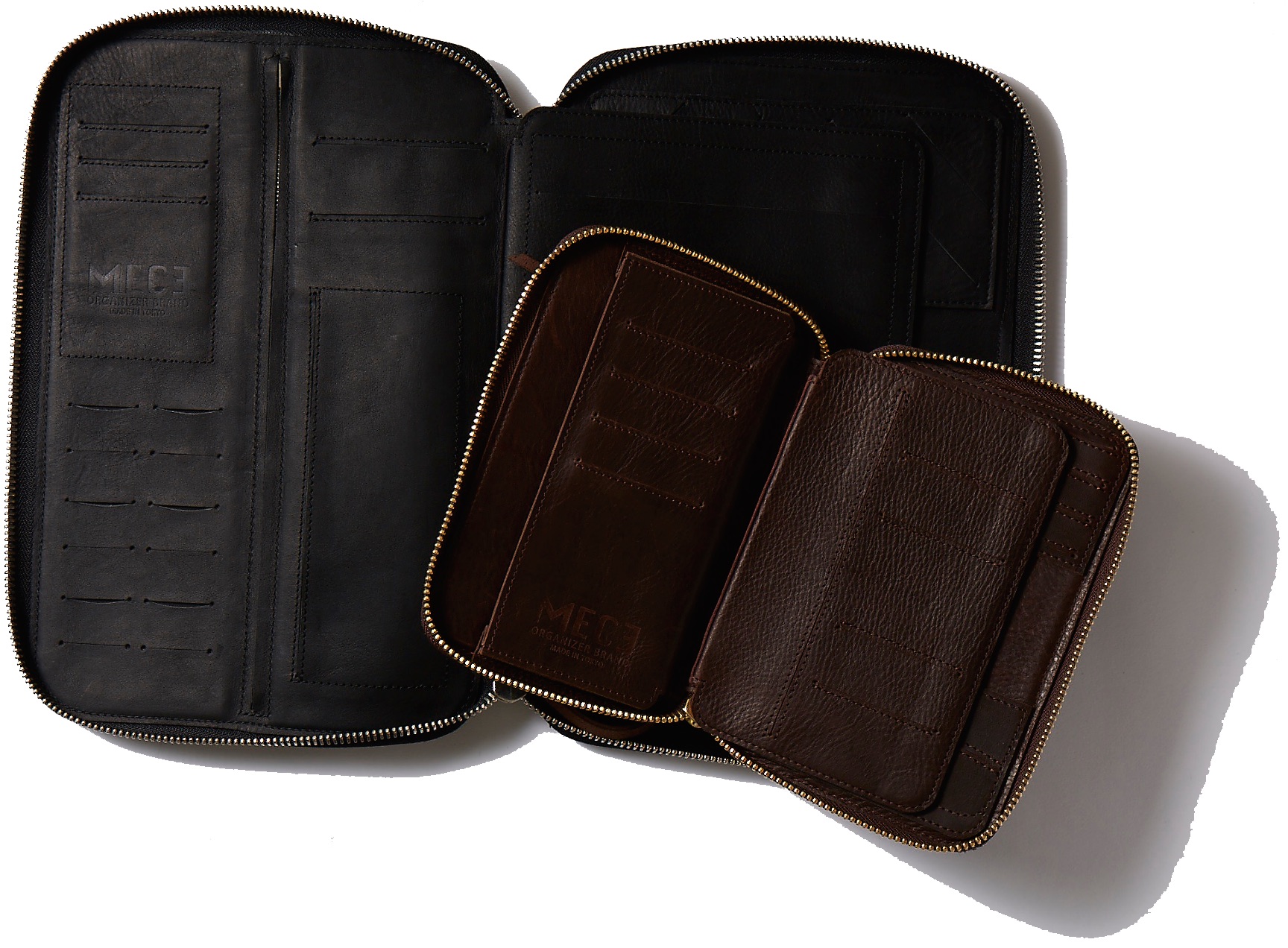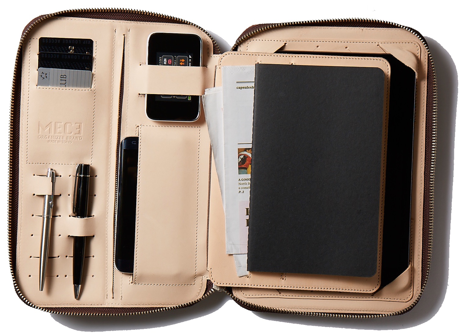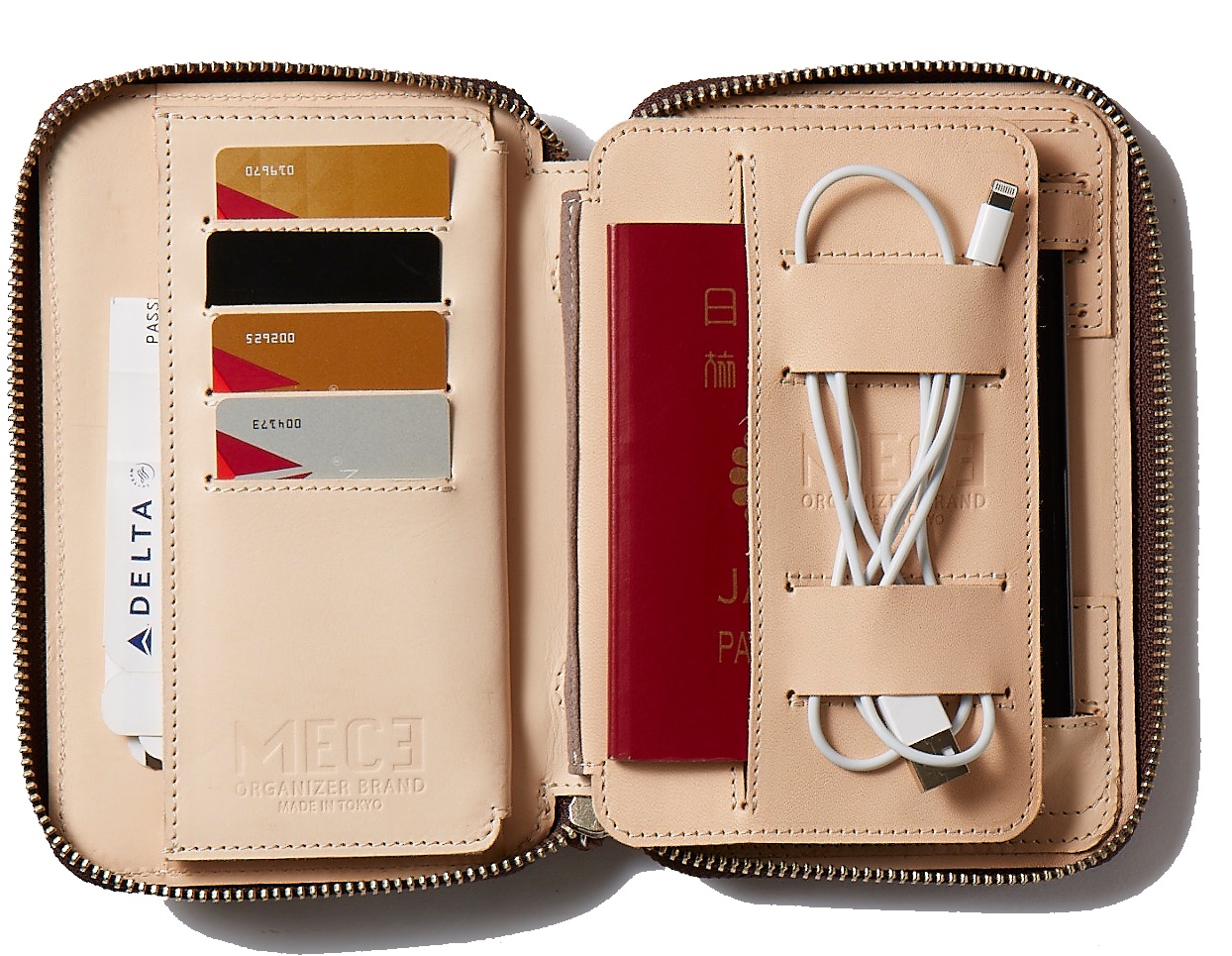 バッグを換えるたびに中身を移動するのは面倒だ。MECEはそんな悩みを一気に解決。中身をみれば実に整然と収納パーツが備えられ、ガジェットからレシートやメモ用紙、ペン、カード、さらにパスポートまで収まる作りになっている。