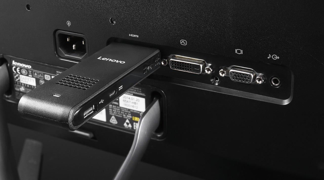 Windows8.1搭載で、テレビやディスプレイのHDMI端子に差し込むだけで使用できる。特筆すべきはやはりその小ささ。手のひらサイズでポケットにも入る。手軽に持ち運べるPCなのだ。