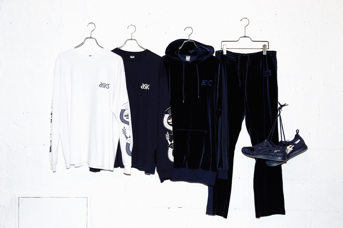 シューズの他、同じくネイビーのベロア素材を用いたフーディ(1万7064円)とパンツ(1万5984円)、そして、龍のグラフィックを両袖にあしらったロングスリーブTシャツ(7020円)がホワイトとネイビーの2カラーで登場。アシックスタイガーオンラインストアなどで発売中です。