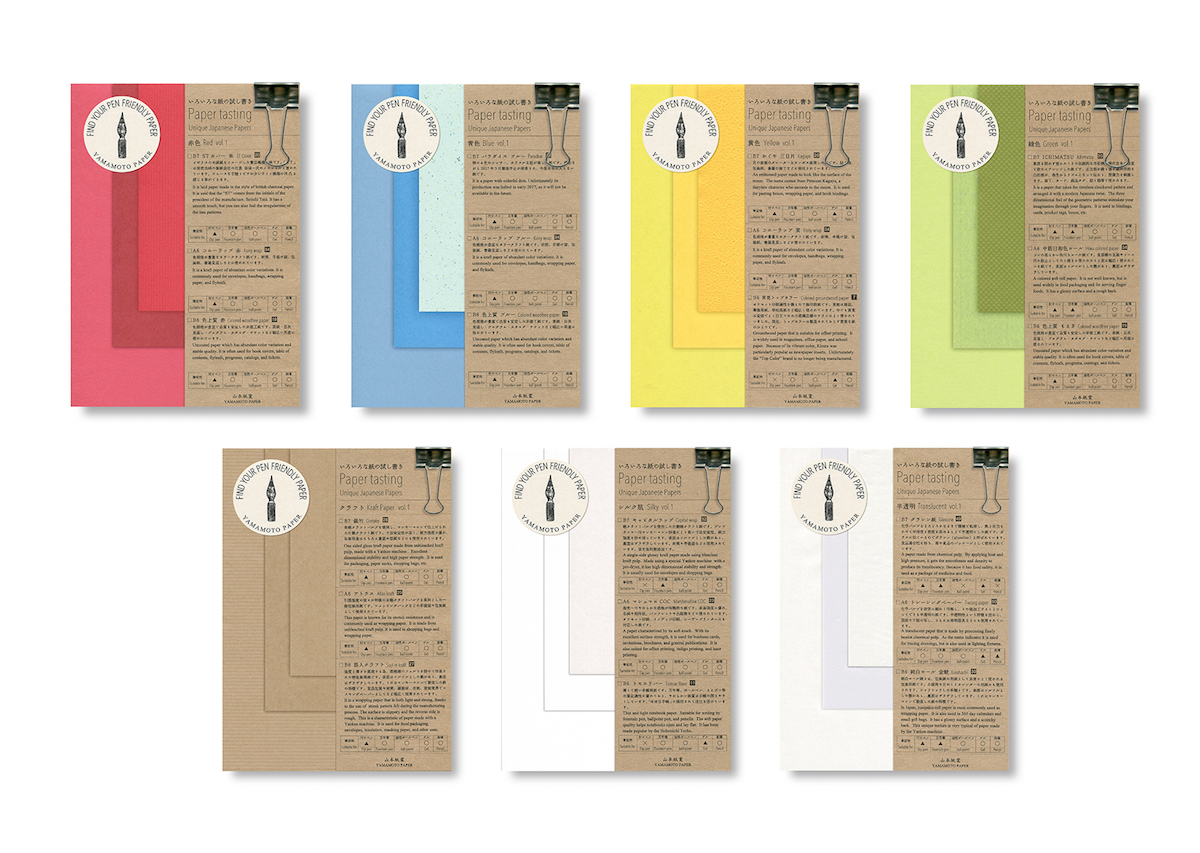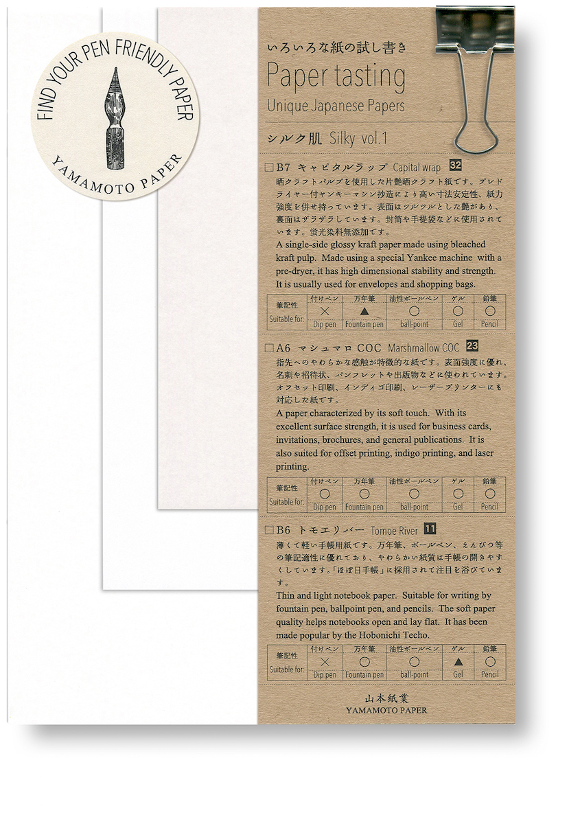質の異なる3種類の紙が3サイズ(各25枚綴り)のワンセットになっており、紙のサイズはB6(128×182mm)・A6(105×148mm)・B7(91×128mm)の3種類(変形寸法もあり)、紙質はシルク肌やクラフトなど全7種類。全て集めれば、サイズの異なる21種類もの紙が揃います。中には製造が中止になった貴重な紙も含まれており、希少性の面でも魅力的です。