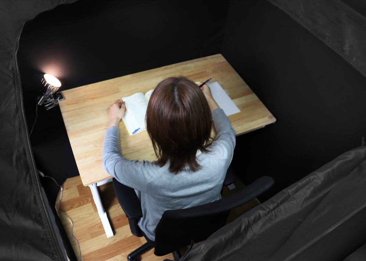 初代モデルに比べてさらに遮光性の高い生地を採用し、入口や天井など窓部を全て締め切ると光が入らない状態を作り出せます。これにより、小さな光が邪魔になる暗室作業時や仮眠スペースなど、多彩な使い方が可能となりました。また、従来の130cm幅に加え、110cm幅の新サイズを用意。自宅で十分なスペースを確保できない方や、より狭い空間を好まれる方にオススメです。