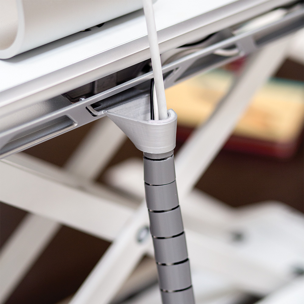 「コードマネジメントシステム」で、デスク周りもスッキリ! ごちゃつきがちなタブレットやスマートフォンの充電用コードは、作業スペースの傾斜部分にあるスロット(開口部)から裏面に通し、背面に繋がるコードレールに沿って這わせておこう。さらに、背面に集まったケーブルやコードは、コードジップを使ってひとつに纏められるのだ。