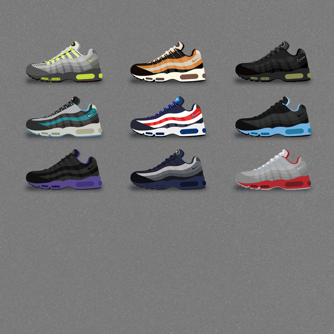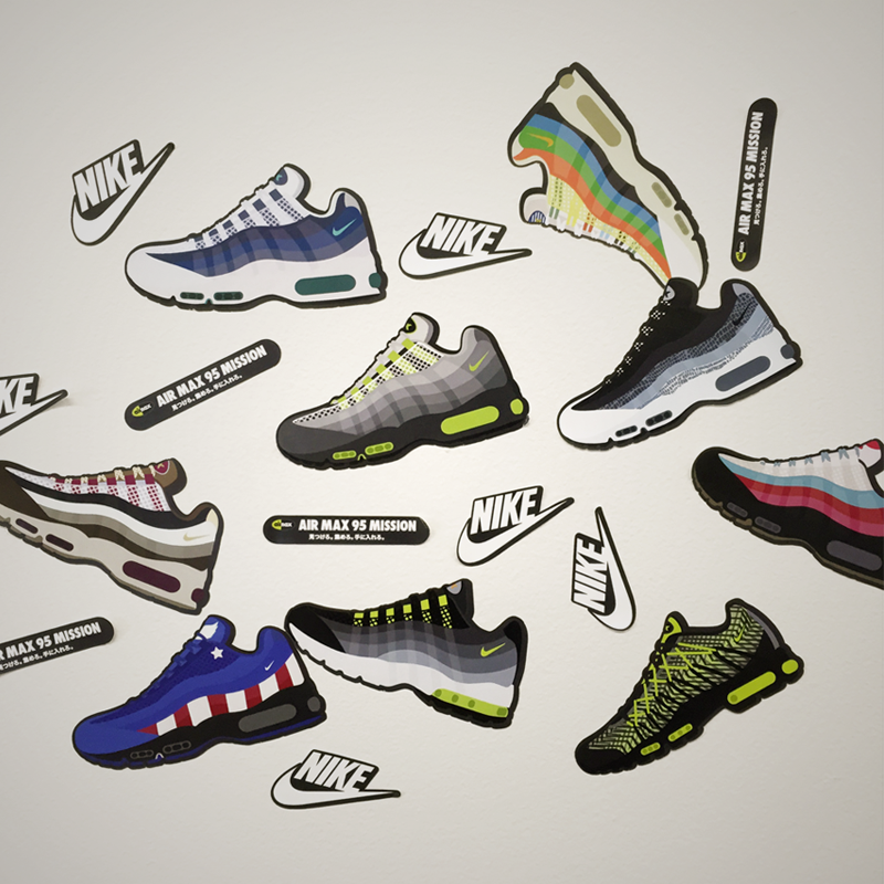 人間の背骨や肋骨、筋肉をモチーフにセルジオ・ロザーノがデザインしたエアマックス95、その当時のデザイン画などのアーカイブ資料を展示するほか、その誕生秘話、さらにはオリジナルモデルや歴代のモデルなど、約60足を展示。