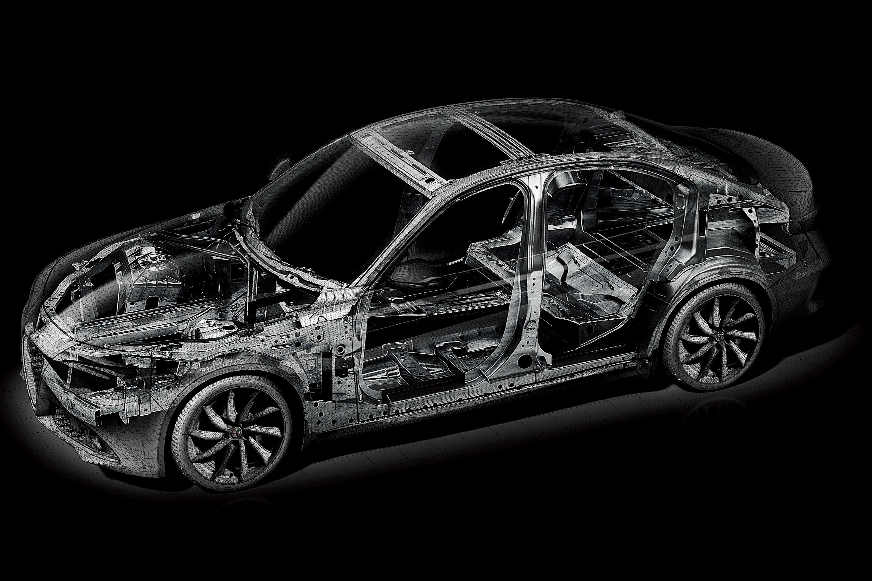 久々のFRモデルだけに、シャーシはもちろん新設計。アルミやカーボンといった軽量素材が多用され、1590kgからという車重を実現しています。そして、軽さはもちろん、前後の重量配分にも配慮しているのが、アルファロメオらしいところ。50:50の前後重量配分は、同ブランドの走行フィールを創り上げる特質のひとつとされ、ジュリアでも徹底して磨き上げられています。