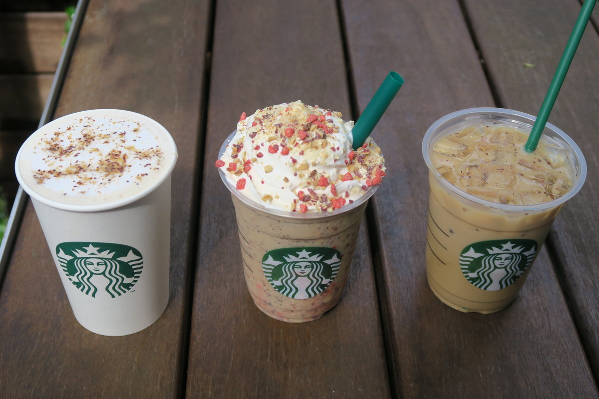 ▲アーモンド ミルクのドリンク3種。左から「ナッティ アーモンド ミルク ラテ(ホット)」、「アーモンド ミルク & グラノラ フラぺチーノ」、「ナッティ アーモンド ミルク ラテ(アイス)」