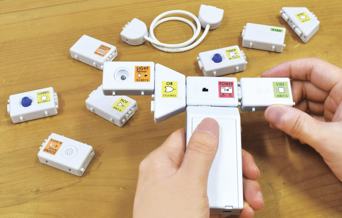 どんな製品かというと、電子モジュールを自由に組み合わせることで、クリエイティブな発想が養える電子工作キットです。たとえば、「ドアが開くと音が鳴るシステム」「拍手すると暗闇で光る道案内LEDのシステム」など。あなたなら、どんな使い方をクリエイトするでしょう!?