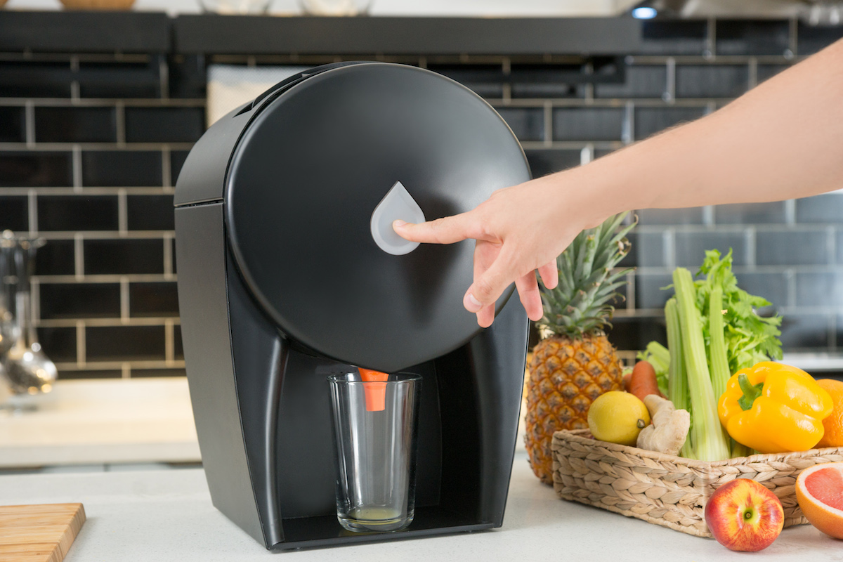 そんな優れたコールドプレスジューサーですが、一番の手間が、食材の搾りかすの手入れ。朝の忙しい時間にサッと作ってサッと飲んで出かけたいとき、本体の掃除がちょっとネックですよね。その手間をゼロにしてくれるのが、「JUlaVIE」です。そのヒミツは、独自開発の専用パック。このパックに切り分けた食材を入れて本体にセットすると、なんと約8.8トンという大人の象2頭分の圧力で押しつぶし、たったの90秒で栄養たっぷりのジュースを1杯分絞ってくれるのです。