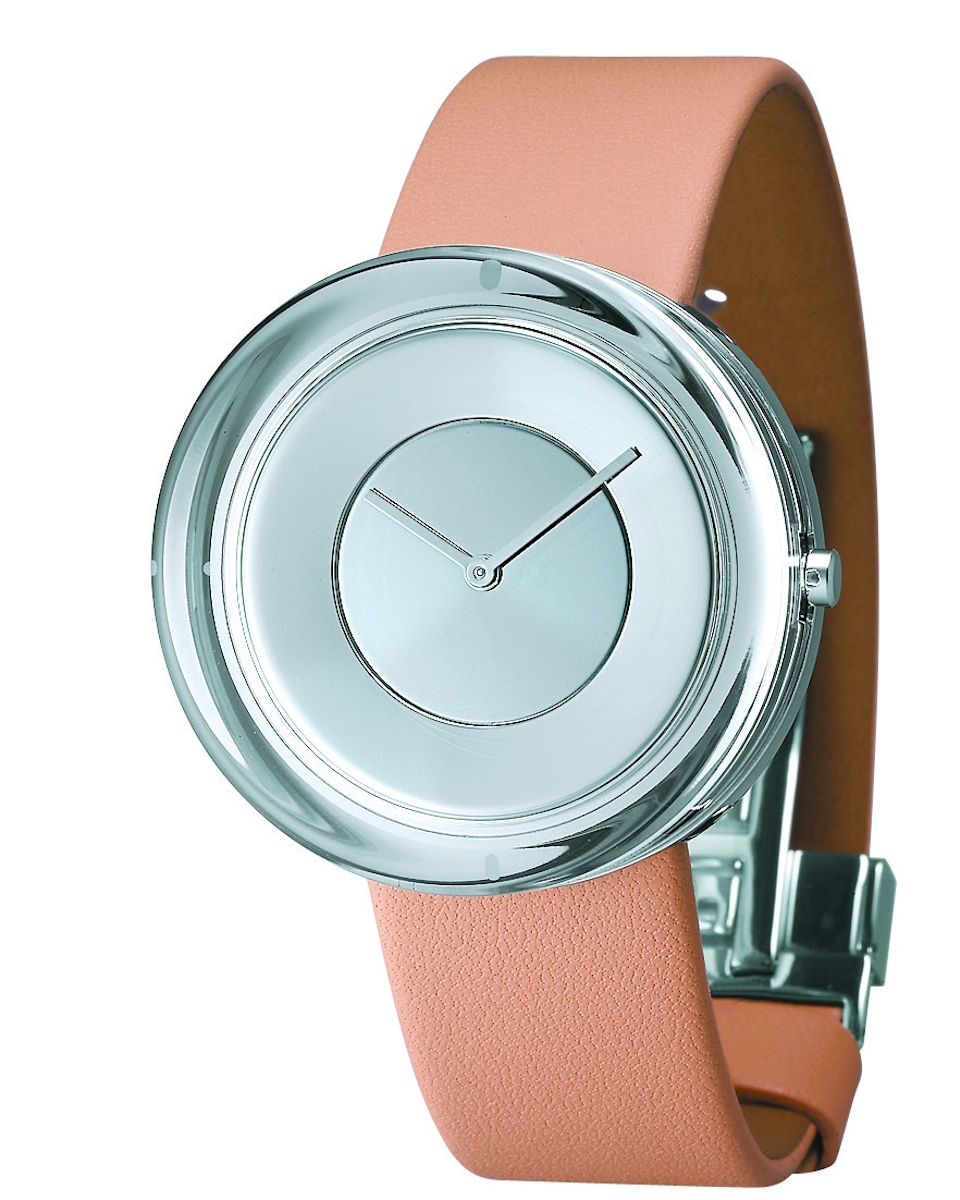 時計本体のガラス素材とは対照的な、温もりを感じさせます。不慮の落下を考慮し、中留はバンドが輪になる三つ折れ方式を採用。着脱が容易な上、着脱の連続によるストラップの劣化も防ぎます。