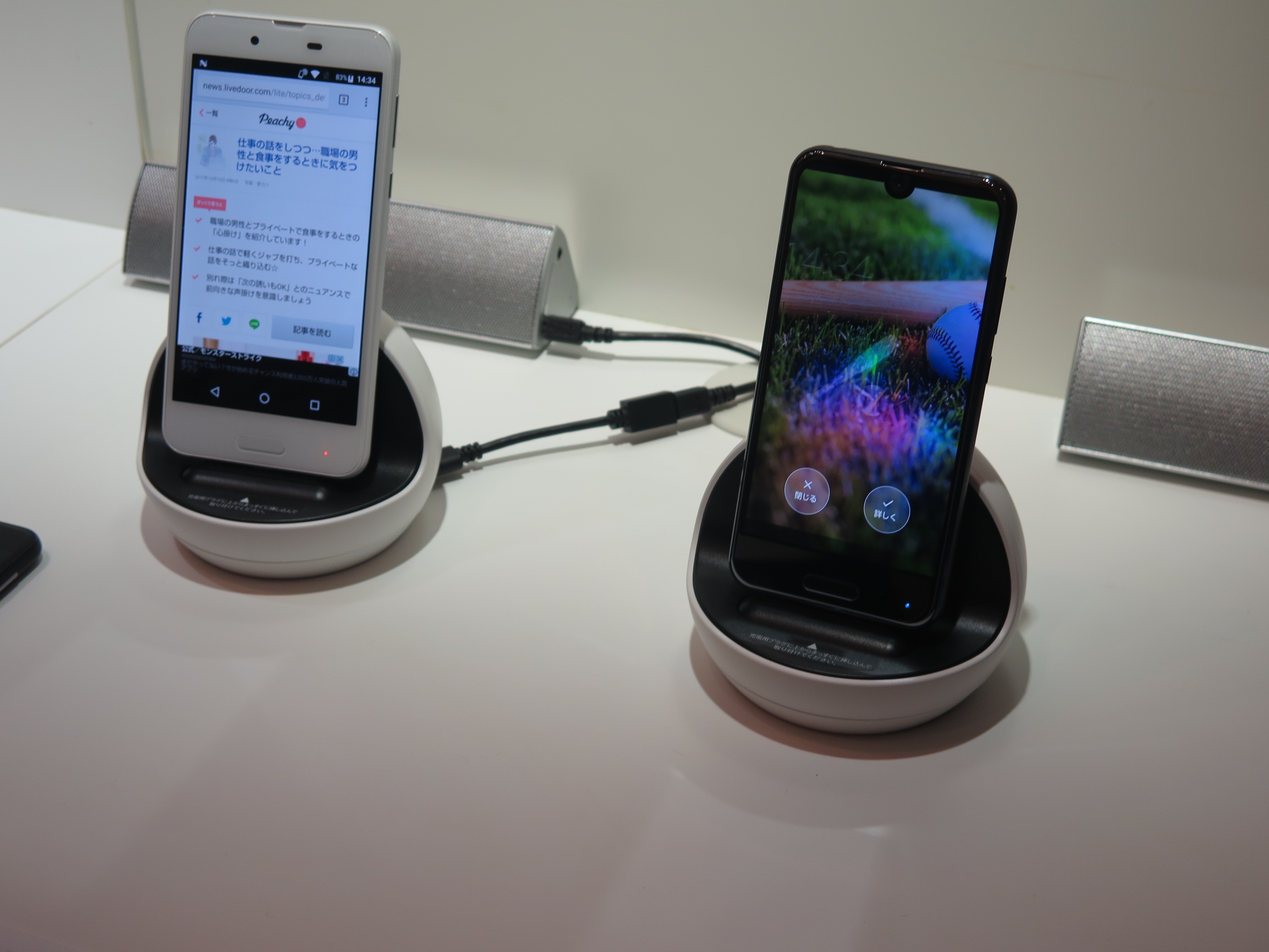 ▲AQUOS R compact、AQUOS senseともに、振り向く卓上ホルダー「ロボクル」に対応。AI機能「エモパー」は7.0へと進化し、ニュースの読み上げにも対応