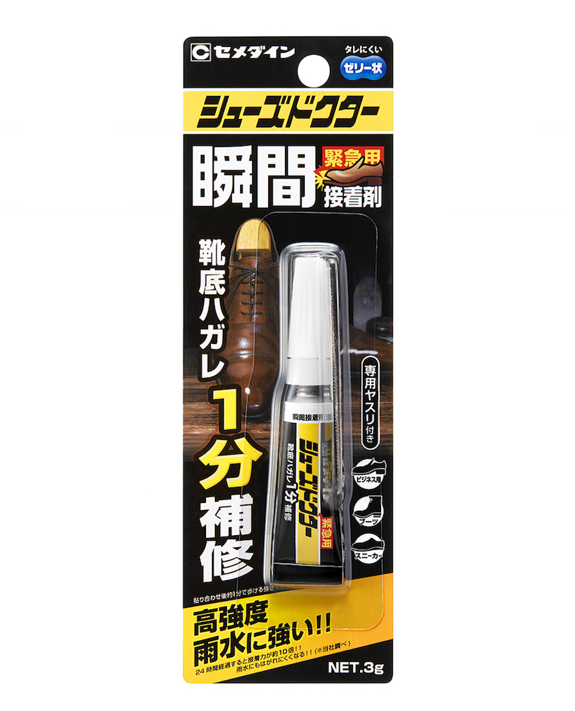 ご存知、セメダインから発売された「シューズドクター瞬間接着剤」は、貼り合わせからすぐに歩行が可能になる靴底補修専用の瞬間接着剤。すばやく強度を発現し、貼り合わせ後わずか1分で歩行が可能になるというスグレモノ。外出中の急なトラブル時に使用できる高強度はもちろん、接着からおよそ24時間で完全硬化し、接着強度は約10倍に。雨水がかかっても剥がれにくくなります。ゼリー状でタレにくく、しみ込みにくいため、革靴、パンプス、スニーカーなど様々な素材の靴底にご使用できます。
