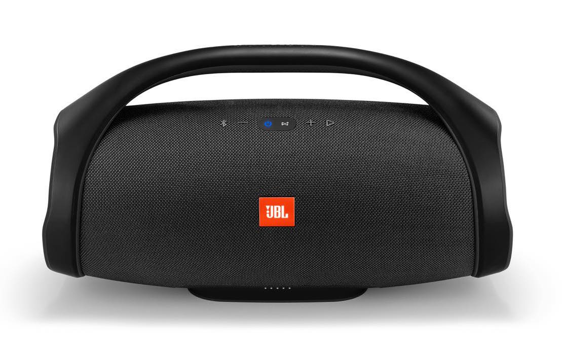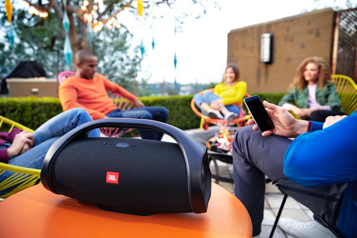 「JBL BOOMBOX」は、20mmツイーターと100mmウーファーによる2ウェイスピーカー構成、低音を増強するパッシブラジエーターの搭載で、クリアな中高域と豊かな低音域再生を実現。「インドア」・「アウトドア」の2つの音質モードを採用しており、場所に応じたパワフルサウンドを楽しめる。