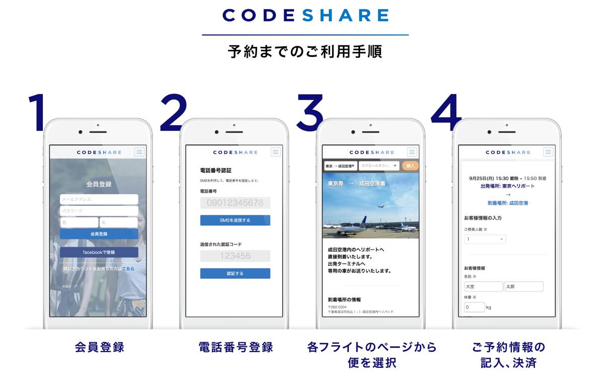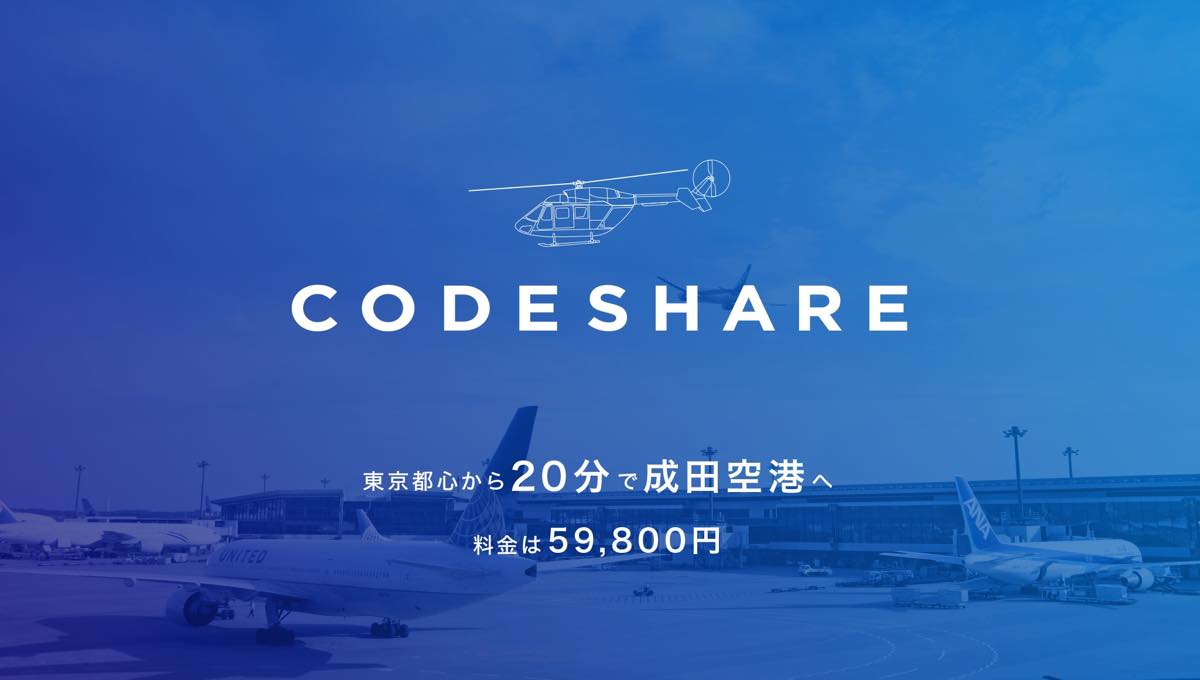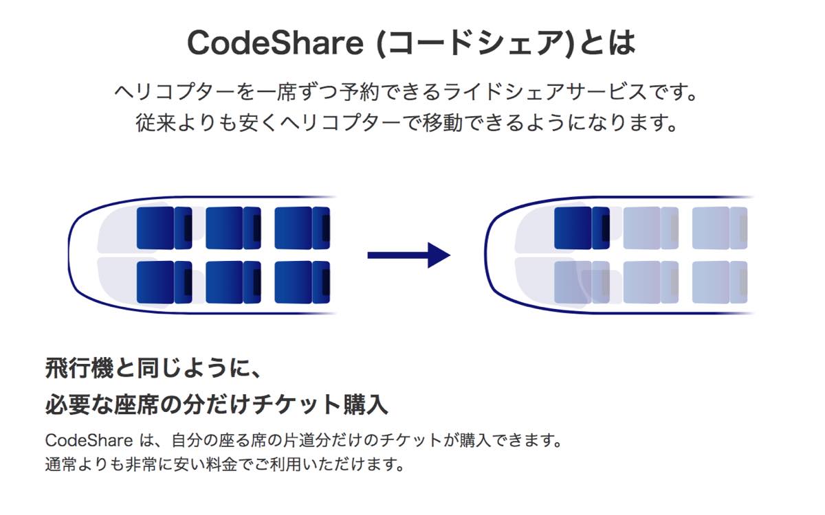 コードシェアはヘリコプターのライドシェアサービス。飛行機と同じように1席単位で予約できるので、従来よりもリーズナブルにヘリコプター移動が可能になった。